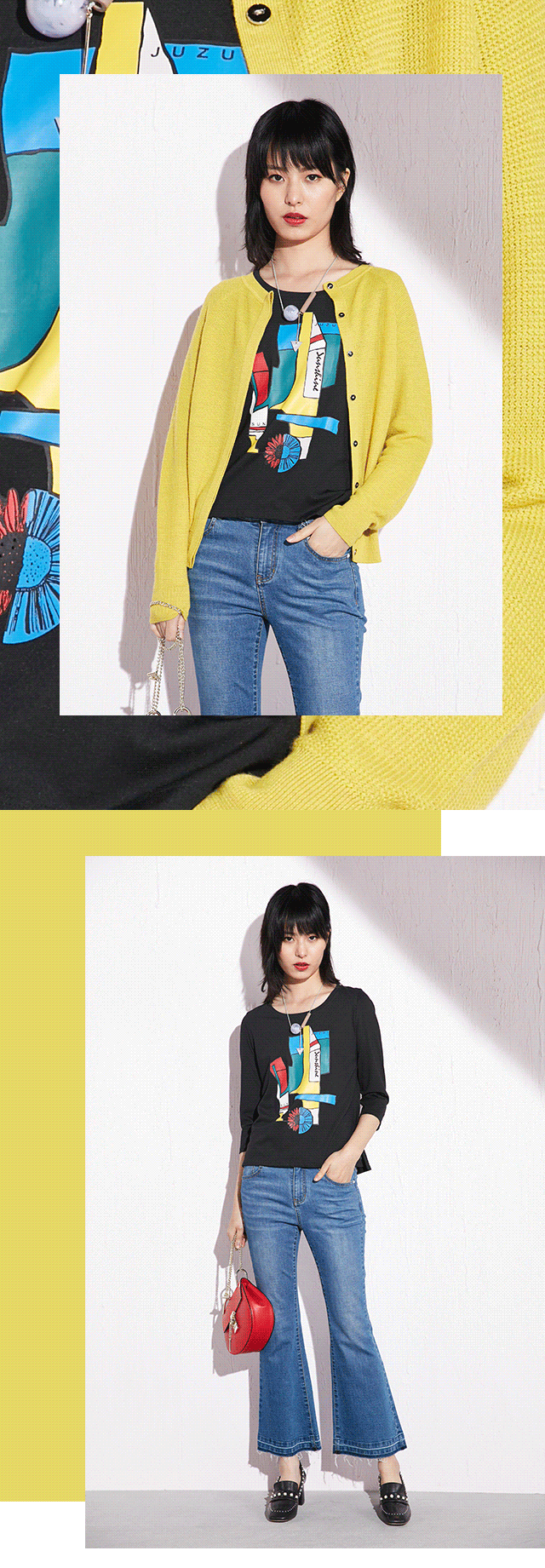 JZ玖姿数码印花T恤,前片sunshine图案,突出其主体性。简洁的廓形和黑色的主色调可以搭配任何外套。