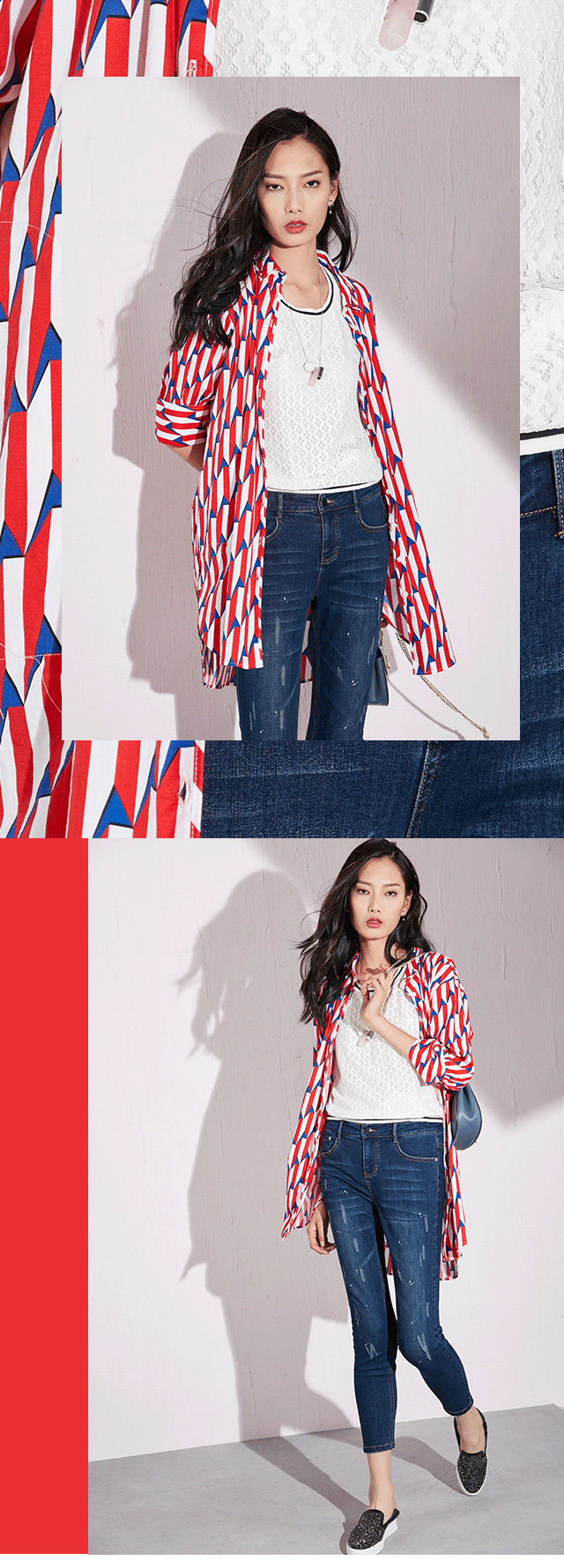 此款衬衫几何印花新颖明快,可以一衣两穿,系起扣子是一款休闲舒适的长款衬衫,解开扣子可以当做一款风衣式外套。
