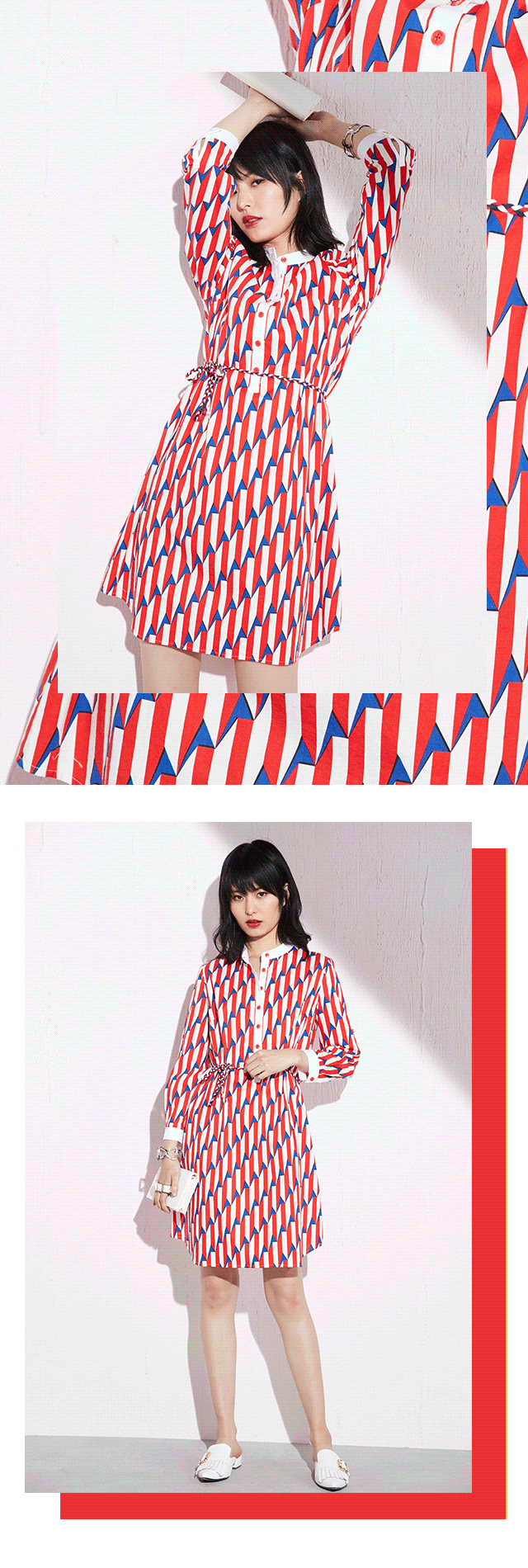 几何印花衬衫式连衣裙,小立领拼接白色棉质面料,是此款设计的点睛之笔。腰部搭配一根细腰带,系起来温婉淑女、散开休闲大方。