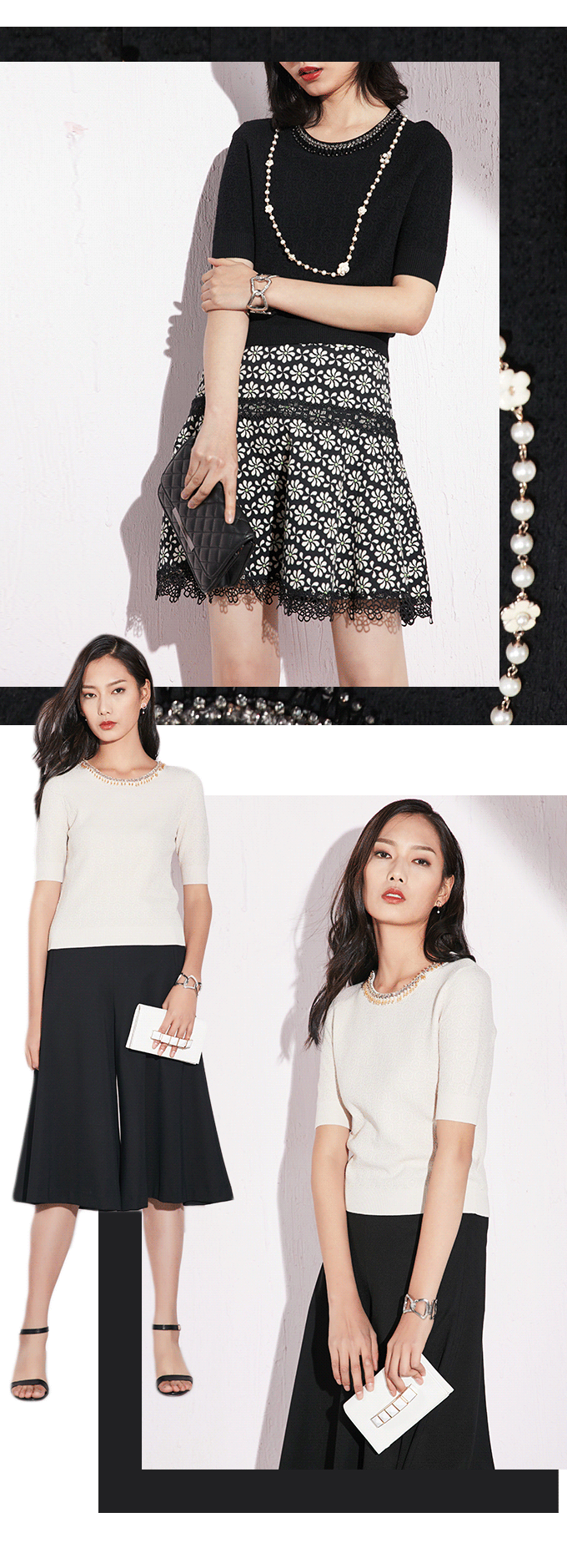 此款套头毛衫,领圈重手工钉珠装饰是画龙点睛之笔,蕾丝花纹式的提花肌理细腻精致。搭配伞型半裙立显十足的优雅小女人味,搭配阔腿裤简洁干练。