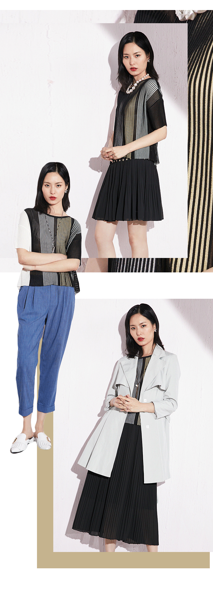经典永存的条纹针织,虽没有轻盈飘逸的质感,却兼具文艺与优雅。除此之外条纹针织衫在穿衣风格方面具有较大的延伸性,即使在匆忙的时间内,也能使你以最快的速度完成一套完美优质的look,轻松穿出时髦感。