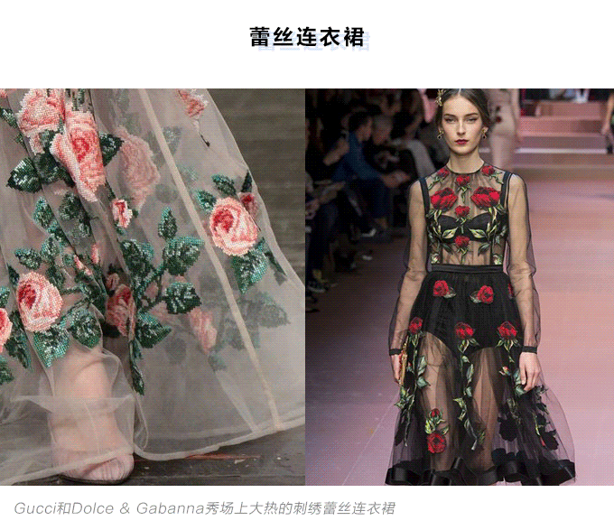 蕾丝面料是一种舶来品,具有轻柔的触感,细腻的镂空雕花,常常给人神秘浪漫朦胧的视觉效果。轻薄、飘逸的蕾丝连衣裙常常给人仙气十足的感觉。
