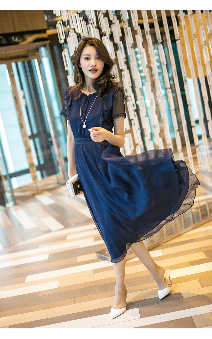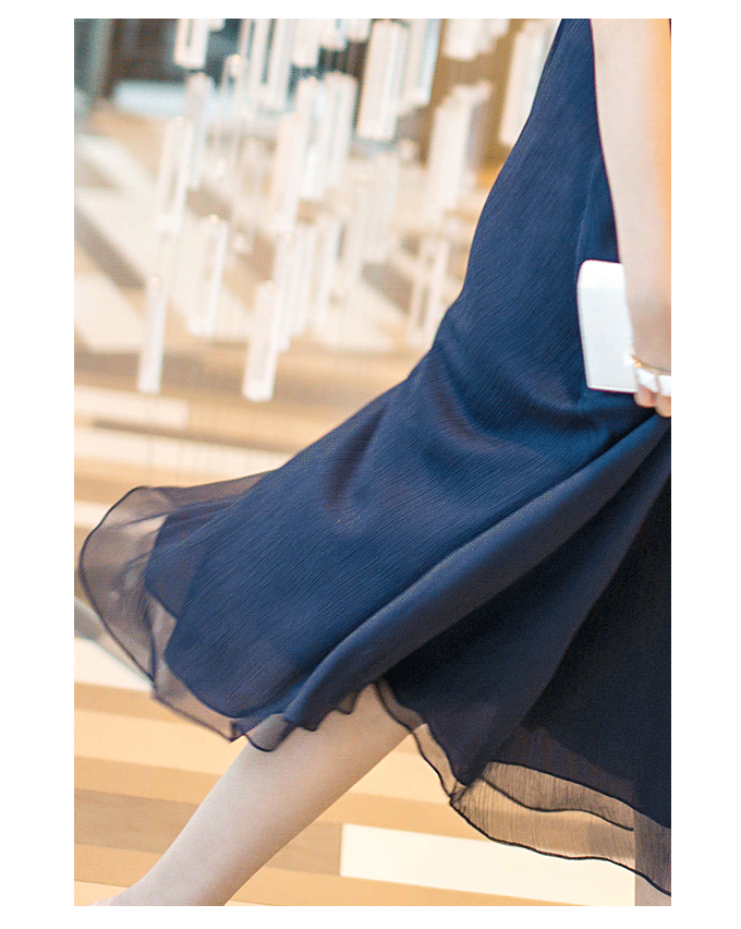 JZ玖姿藏蓝色雪纺连衣裙,面料经纬疏朗,特别易于透气;由于飘逸滑爽通透的特性,此款连衣裙给人无与伦比的美妙效果,充满浪漫的味道。