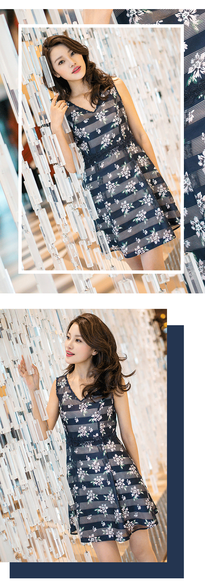 洋溢着轻熟女性的柔美情怀花朵,趣味的与藏青明暗宽条纹的结合,工艺考究提升整体精致度。夏季穿着舒适清凉,呼吸感强。
