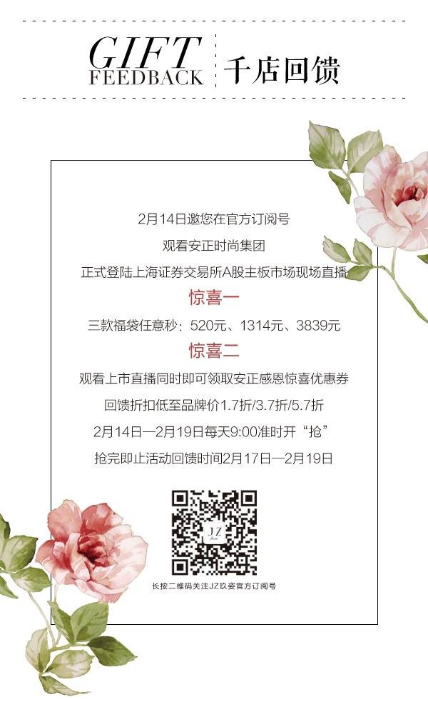 作为一家坚持匠心与创新精神的公司,不仅要能够与潮流趋势同步,引领品质魅力生活,更重要的是从“心”出发,让消费者感知品牌深层的理念,以用户为先,塑造良好的用户体验和价值。作为首个邀请VIP客户共同敲锣的上市公司,安正时尚集团邀约旗下最具代表性的VIP顾客,共同见证这一历史性时刻。在上市仪式上,JZ玖姿崇尚精致生活的都市成熟女性着JZ玖姿特别款与安正时尚谱写“浪漫情缘”,惊艳全场。
