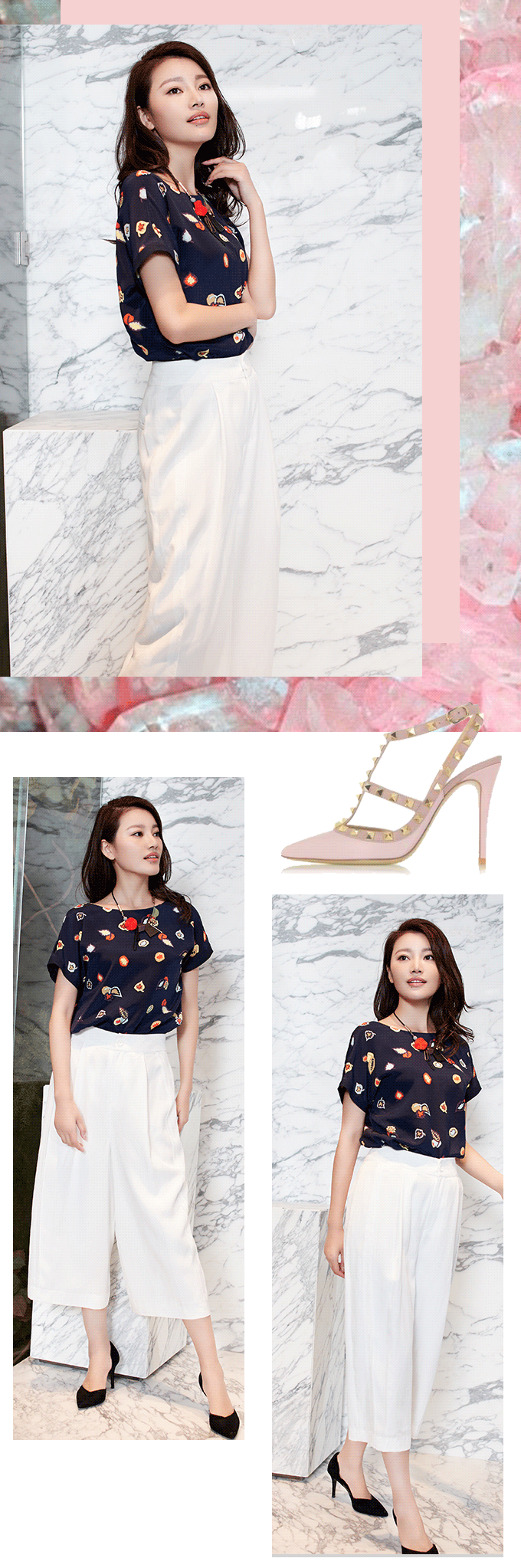 跟上潮流也是打造无龄感的有效途径,娘man平衡可是时下最流行的穿搭法则,不妨拿来一试。黑色高腰阔腿裤,纤细的脚踝与飘逸的裤管形成对比,立即产生强大气场,搭上印花短袖就柔和不少;而白色宽松型八分裤要配上深蓝印花短袖及黑色小高跟,才是平衡之道。