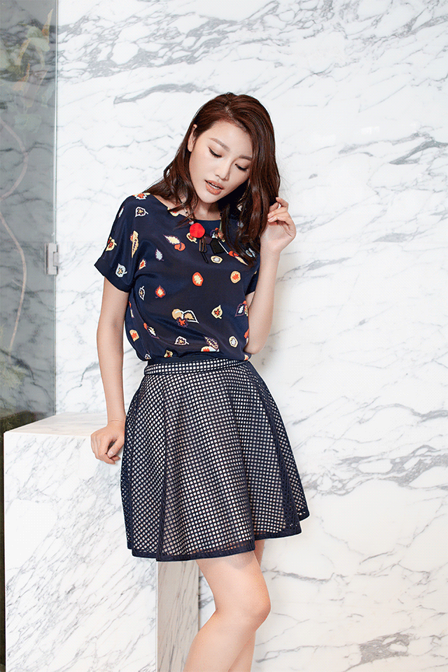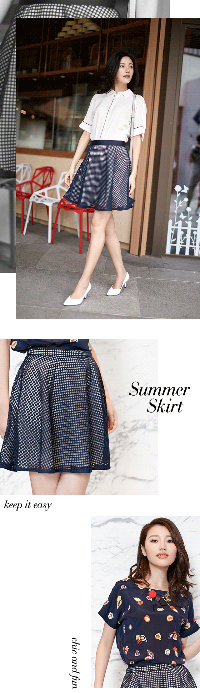 夏日最忌繁琐,色彩配饰不宜过多,简约才是透气之道。半裙以藏青网格、白色雪纺为面料,柔软舒适。蓬松版型,搭配白色桑蚕丝衬衫,干净甜美;或选择同系列不对称领口印花T,凸显锁骨,打造优雅小性感。