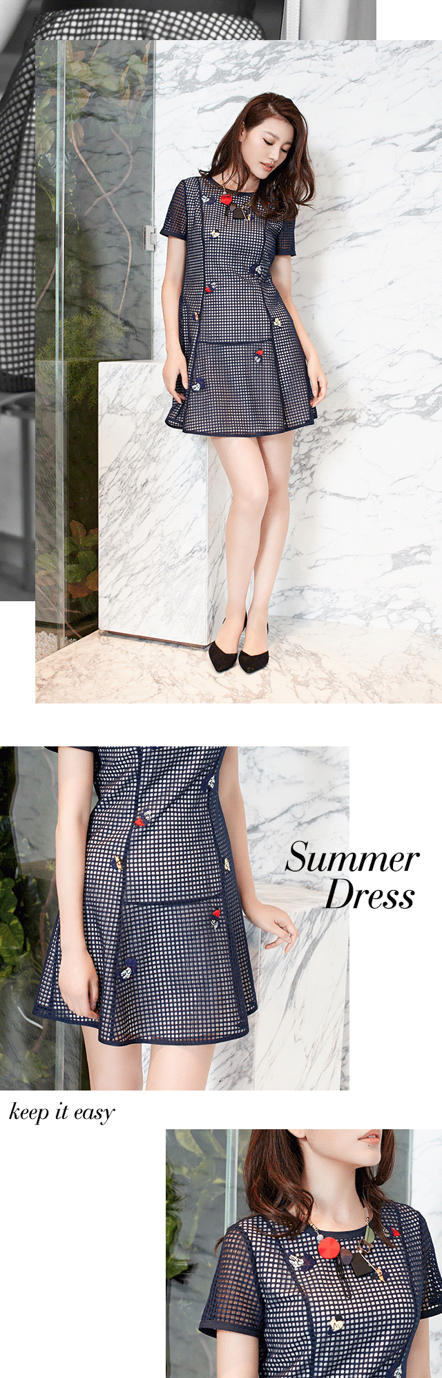 当然,最简约的穿搭莫过于着一身清爽时尚的连衣裙,独特精纺花边网格与布面相复合,兼具透明感及轻薄感,X廓形贴合身体又不加束缚,服饰已有花叶点缀,坠一条同色系的几何项链既简约又不失细节,夏日透气搭配,就是这么简单。