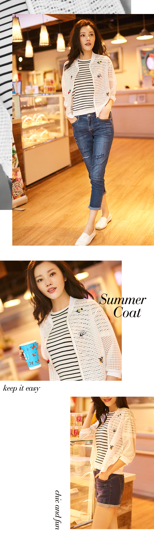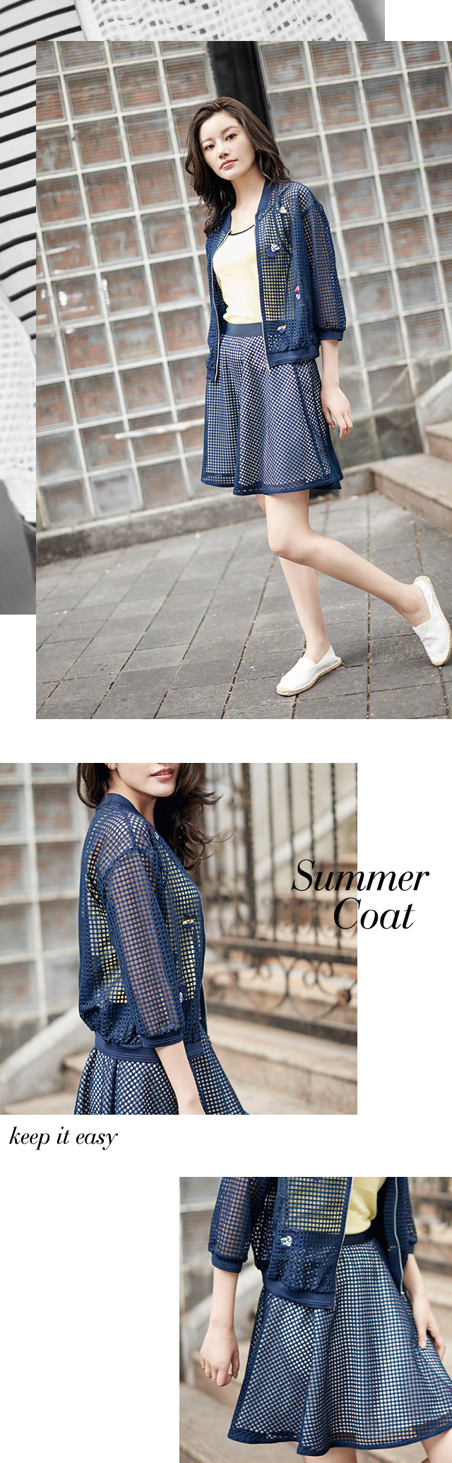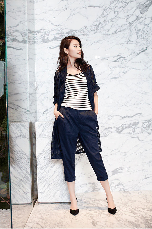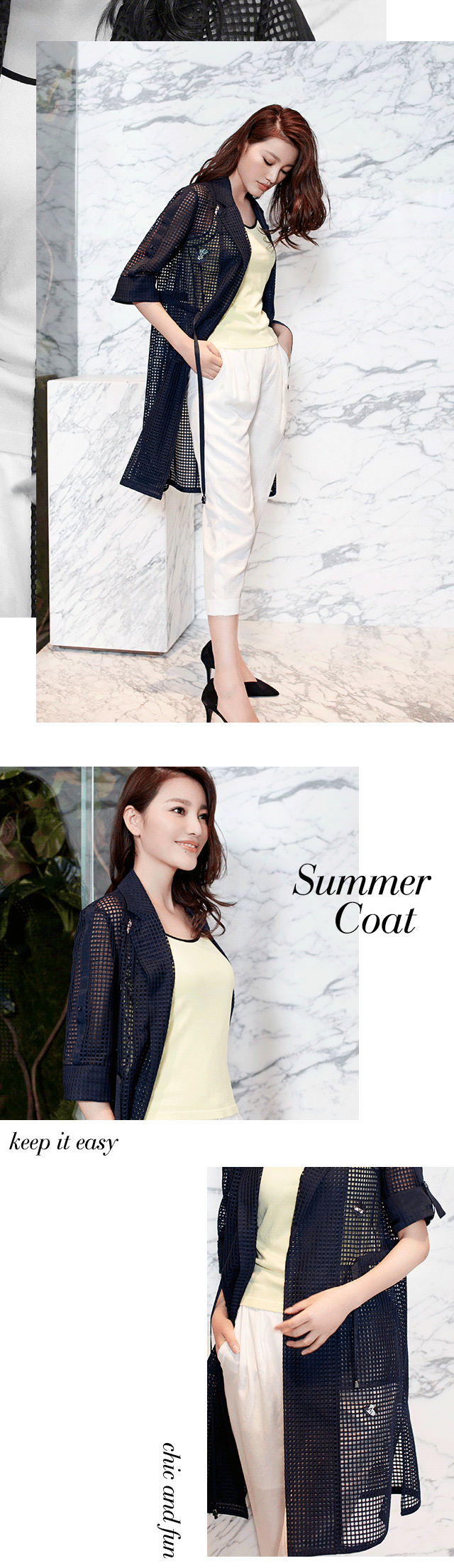 鹅黄吊带简洁大气,搭配白色铅笔裤,别样清爽;条纹则经典时尚,组合丈青色八分裤,休闲十足。可夏日出行,防晒最是要紧,吊带外搭中长款风衣式外套,单层网格轻便透气,可谓夏日防晒必备单品,加上趣味贴布绣,优雅不失活泼。