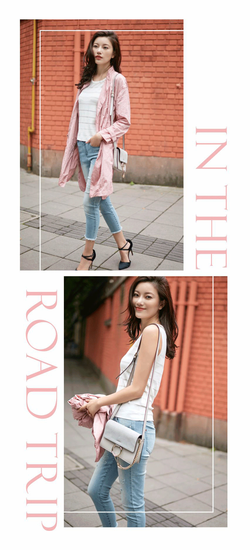 同系列金属粉风衣,则更具少女感,活力又减龄,小立领及斜门襟的设计细节打破风衣的沉闷,炎热时候将它脱下卷起,体积小而不占空间,轻便易携。
