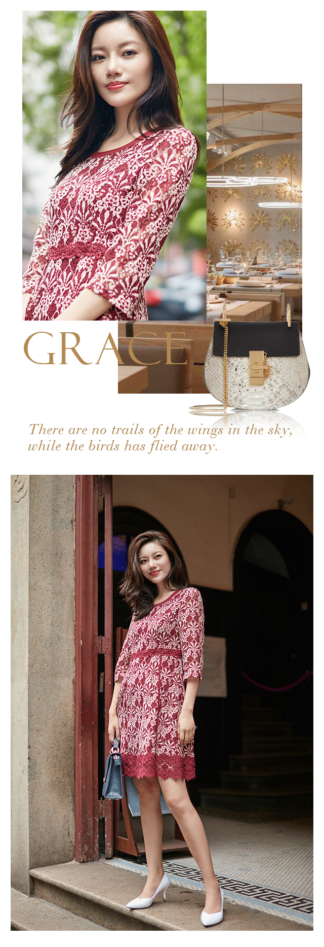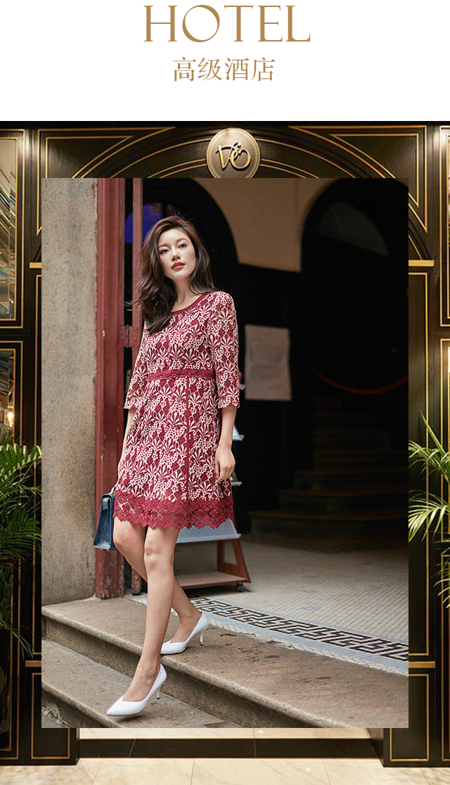 既然是高级酒店,正式一点是必要的,为了避免呆板,可选择这条酒红色连衣裙,不扎眼却足够引人注目;自18世纪就流行于宫廷的蕾丝,始终带有贵族气质,加上镂空的裙摆设计更添精致之感;搭配一双白色细高跟尽显优雅。
