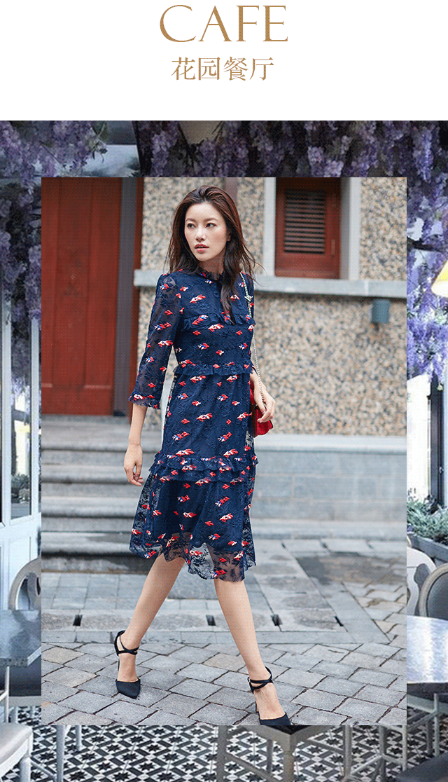 花园餐厅生机盎然,JZ玖姿的归雁图案与其遥相呼应更是锦上添花;层层裙摆波浪起伏,结合复古丝绒飘带,随风而动,既甜美又浪漫。