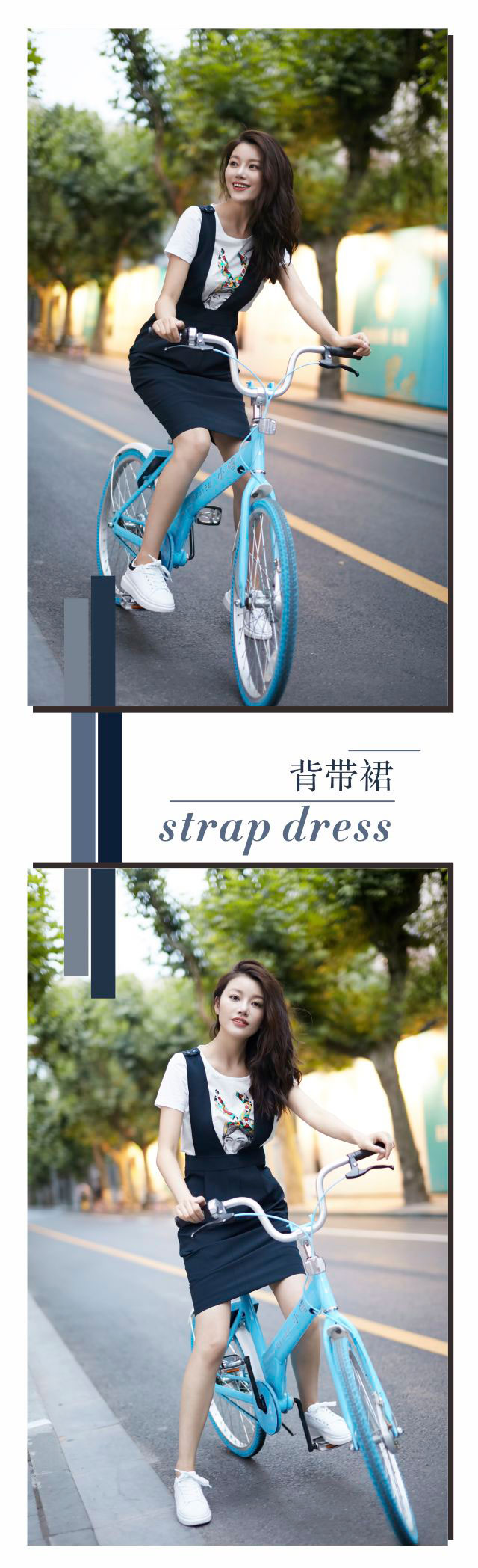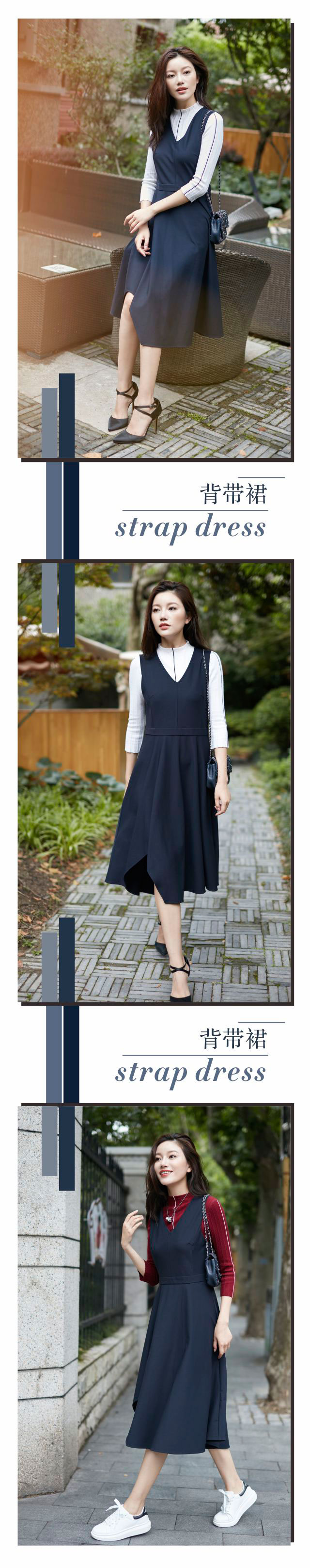 长款的裙装本就容易穿出优雅来,白色打底小衫及背带收腰设计均有修饰身形之效,令穿着者提升气质;不对称设计的错落裙摆则是画龙点睛,随意走动,就能划出的优美曲线,赏心悦目。