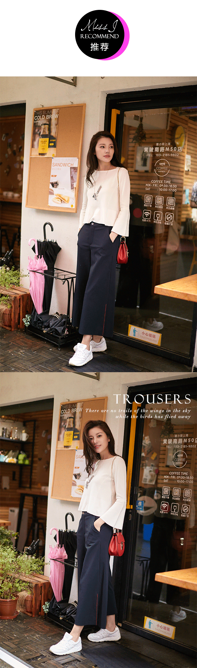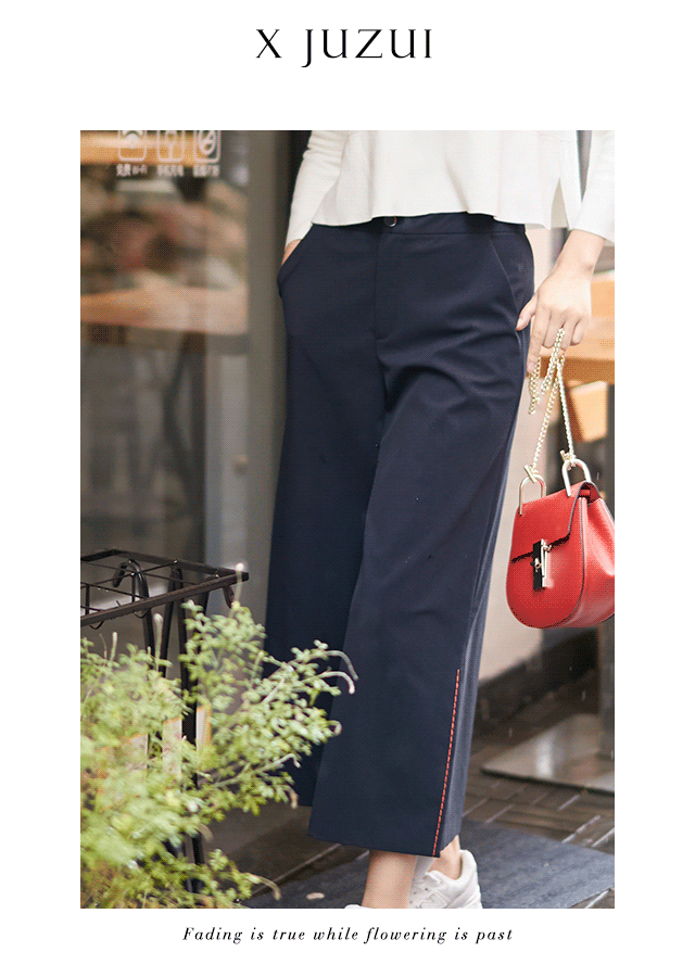 如今,阔腿裤同时尚更是紧密相连。JZ玖姿丈青九分阔腿裤在舒适的四面弹面料上,将基础的阔腿裤版型结合时下流行的撞色元素,融入了更加女性化的开衩设计,更具有个性,搭配一字肩、喇叭袖的白色小衫,休闲亦不失优雅。