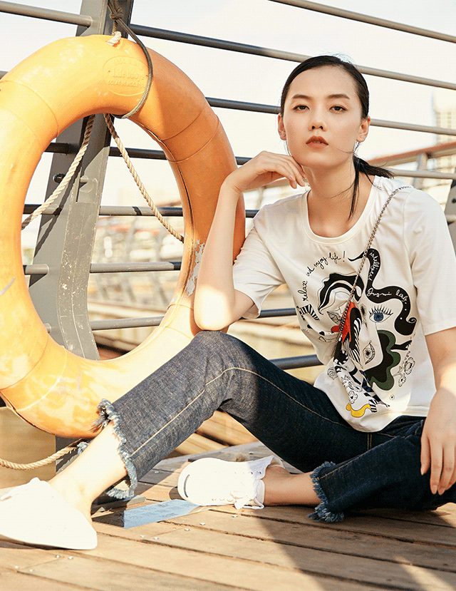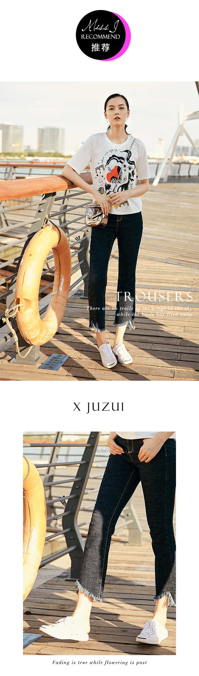本款牛仔喇叭裤,裤脚的不规则设计,错落有致,尽显层次,十分个性;搭配一抹亮色,增加整体的时髦程度。