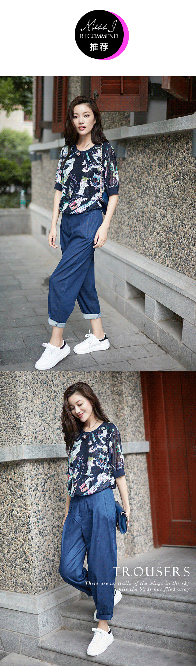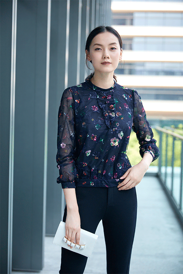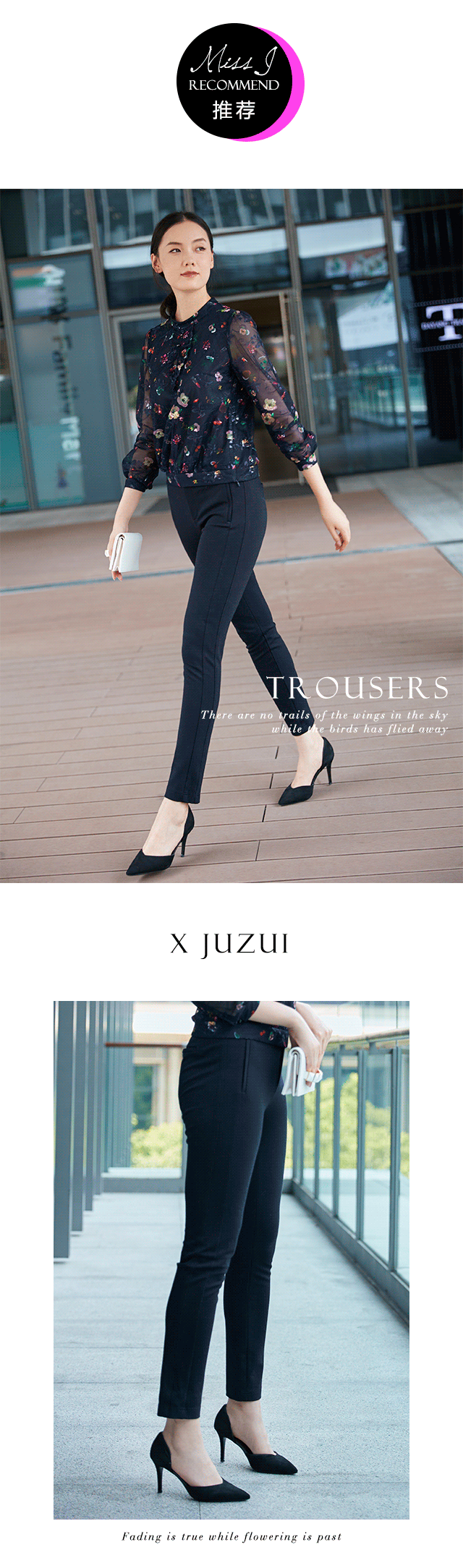 JZ玖姿丈青铅笔长裤运用针织面料,弹力充足,伸展有度,穿着更舒服。精致的网布绣花上衣,搭配丈青铅笔裤,优雅休闲两者兼得。