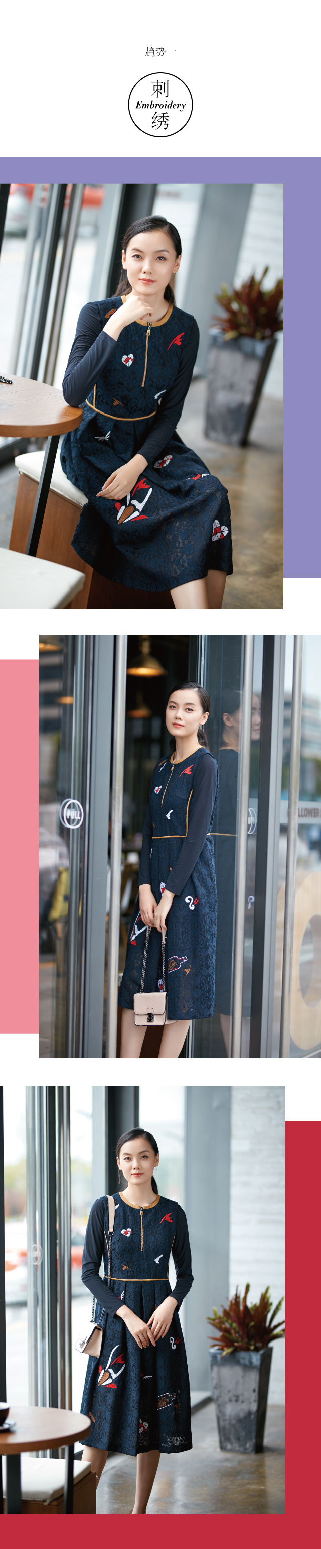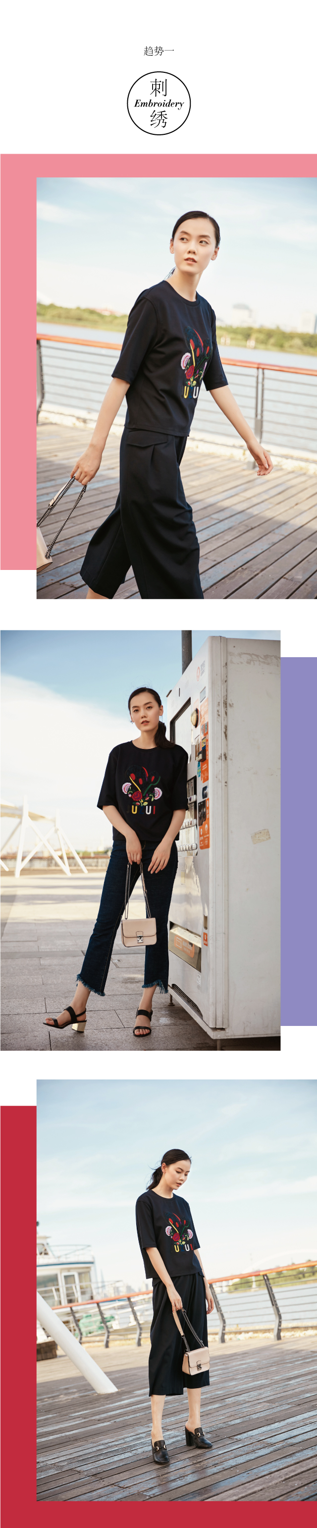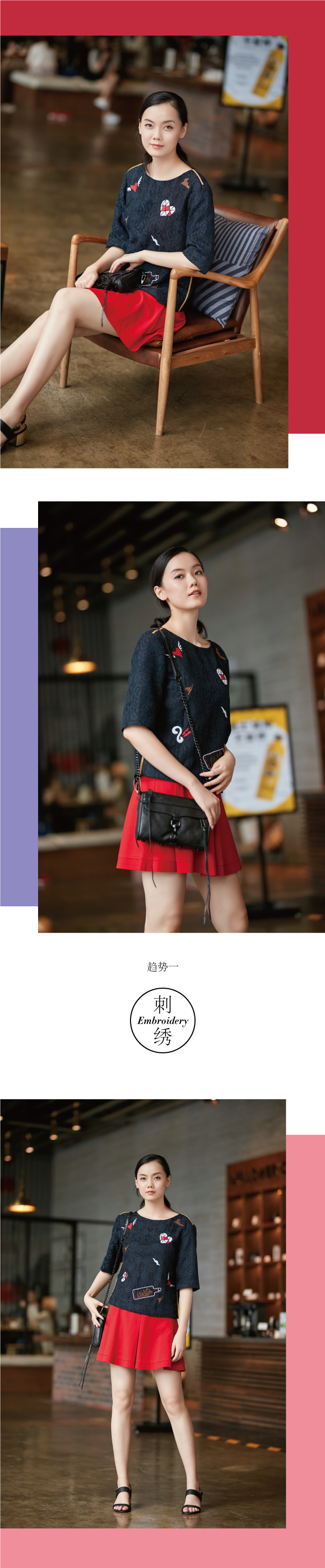 作为中华民族优秀的传统工艺之一,刺绣典雅高贵的属性使它备受国内外的设计师喜爱。JZ玖姿钟爱彩绣技艺,针脚绵密,绣面却平服,彩线交织,令趣味心形更显生动,好似彩蝶从鲜花中呼之欲出,穿上本款中袖上衣,在情人节秀出甜美气质。