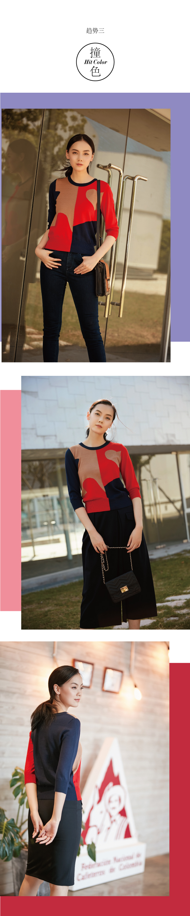 除此之外,撞色也是众多名人明星、时尚达人们热爱的元素之一,但太夸张的撞色设计一不小心就会穿成乡土风,JZ玖姿本款小衫采用三色相撞形式,爱心在不规则色块中脱颖而出,既有复古风情又不至于太过浮夸。