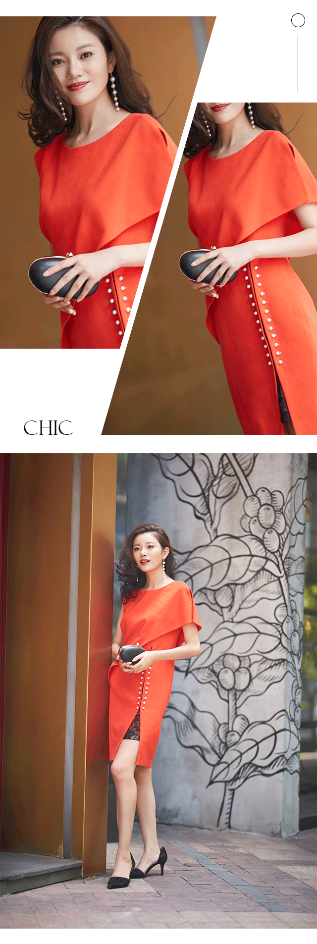 当然,对比黑色,亮色更易吸引眼球,同款橘红色连衣裙,活泼靓丽,搭配黑色高跟及手包,轻松成为晚宴焦点。