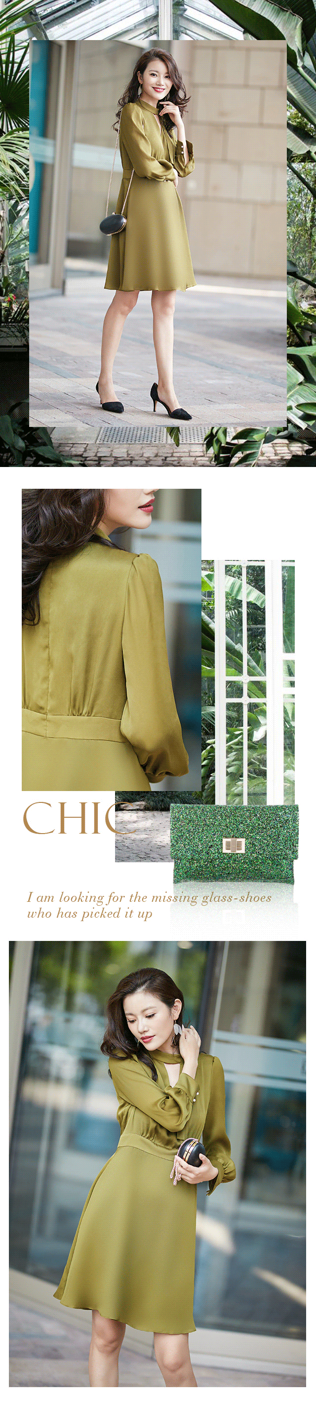 时已入秋,除了黑色与橘红色,最应景的还属军绿与芥黄的间色,季节过渡,树叶随之变化,把这动态的自然淋漓尽致地展现于本款修身真丝连衣裙之上,更显美感。v型镂空与圆环飘带的结合,切中流行,演绎柔美chic lady。