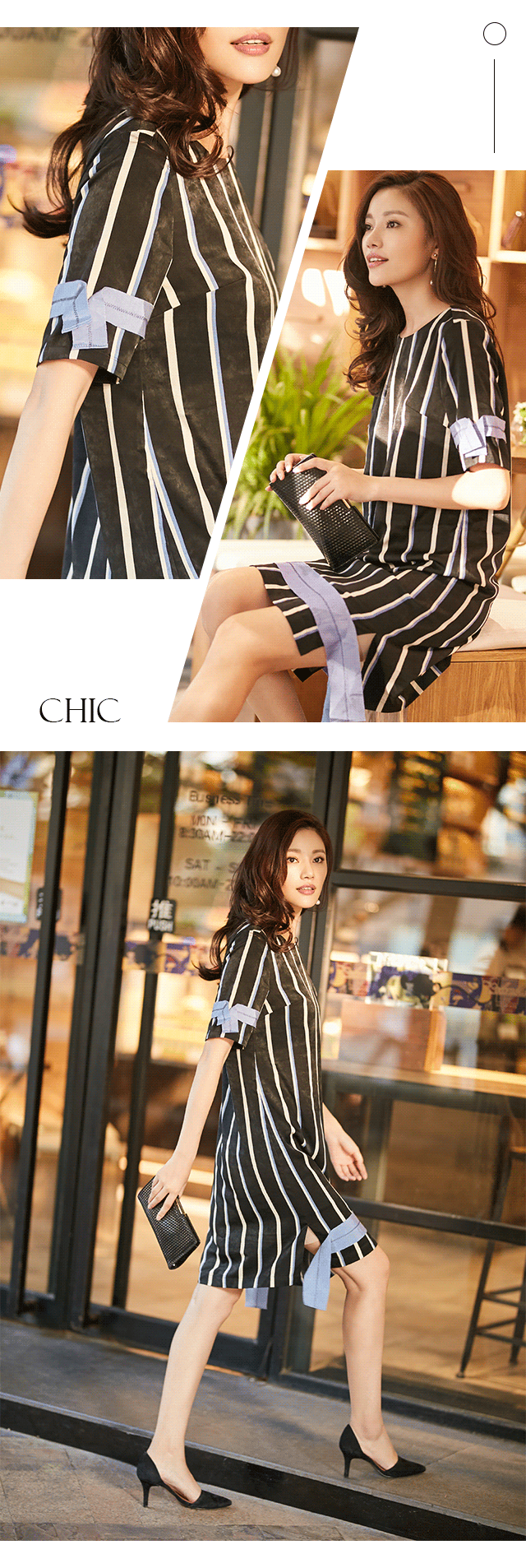 条纹始终是活跃于时尚浪潮里的中坚分子,代表着理性与冷静,诉说着浪漫与优雅,百搭又富有变化。JZ玖姿宽窄相间的竖条纹连衣裙,视觉显瘦,与横条织带交错,设计感极强。采用亚光磨毛面料,手感细腻又亲肤,让约会穿着有型还舒适。