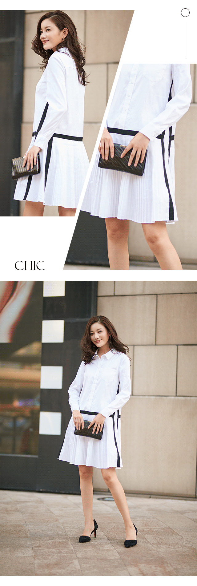 衬衫是经久不衰的时髦单品,由此衍生出的衬衫裙,亦成为了衣橱必备的经典款之一。鱼尾下摆设计,摇曳生姿;黑边勾勒曲线,挖掘出职业女性甜美时尚的另一面。