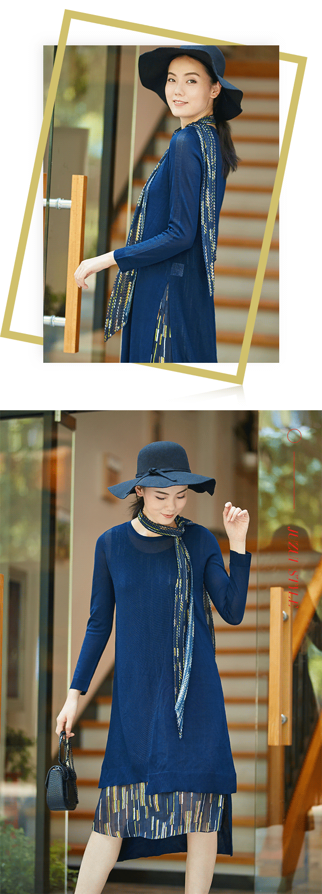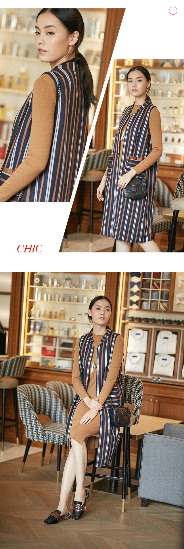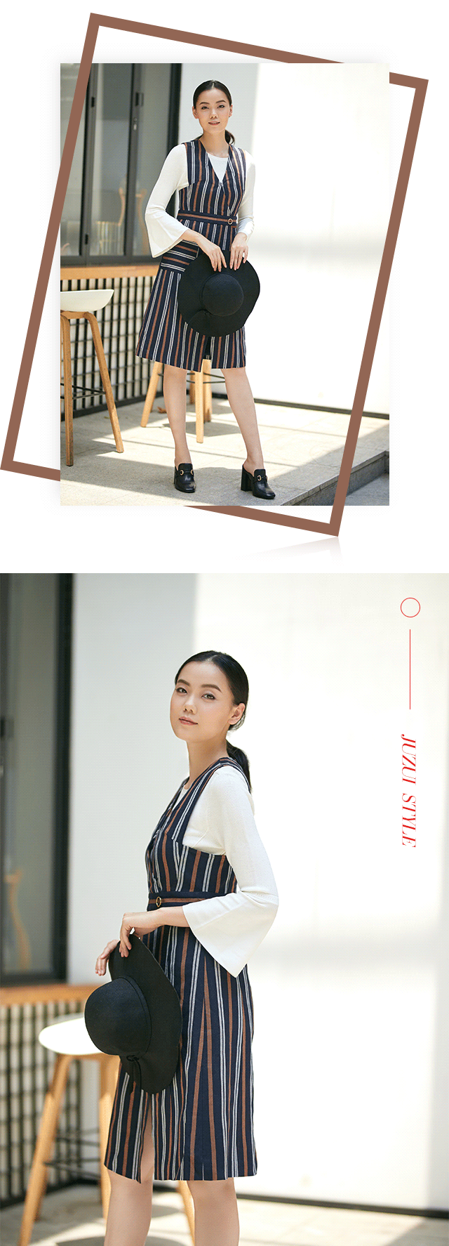 相比于横条纹,竖条纹可将人纵向拉长,提升高度,且较为硬朗,更显质感。JZ玖姿本款背心裙的竖条纹与常规条纹大有不同:一是配色,印加金、暮色蓝以及陶瓷白的流行组合,降低了明度,掩去了锋芒,沉心静气;二是距离,宽窄不一,调和了色彩比例又丰富了视觉。X版型,收敛腰身,开衩设计,体现精致,既适应职场,又契合日常所需。