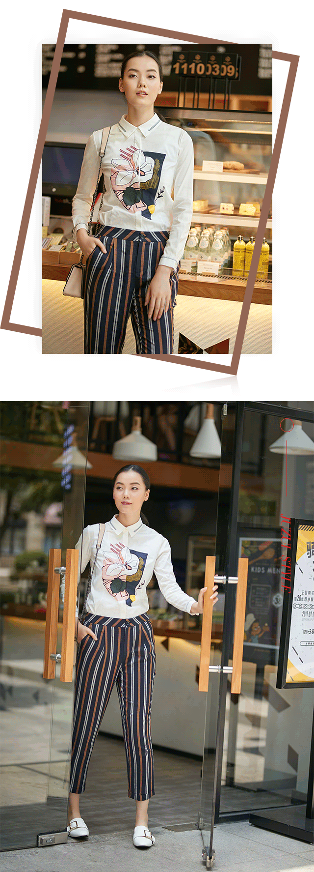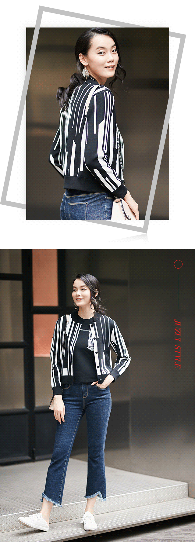 除了间隔距离,形态的变化亦是非典型性条纹的特征之一。中规中矩的黑白竖条纹断裂变形之后,竟平添些许动感,如同钢琴的黑白两键,相互配合,奏出欢快乐章,再搭上一条微喇牛仔,畅享街头休闲好时光。