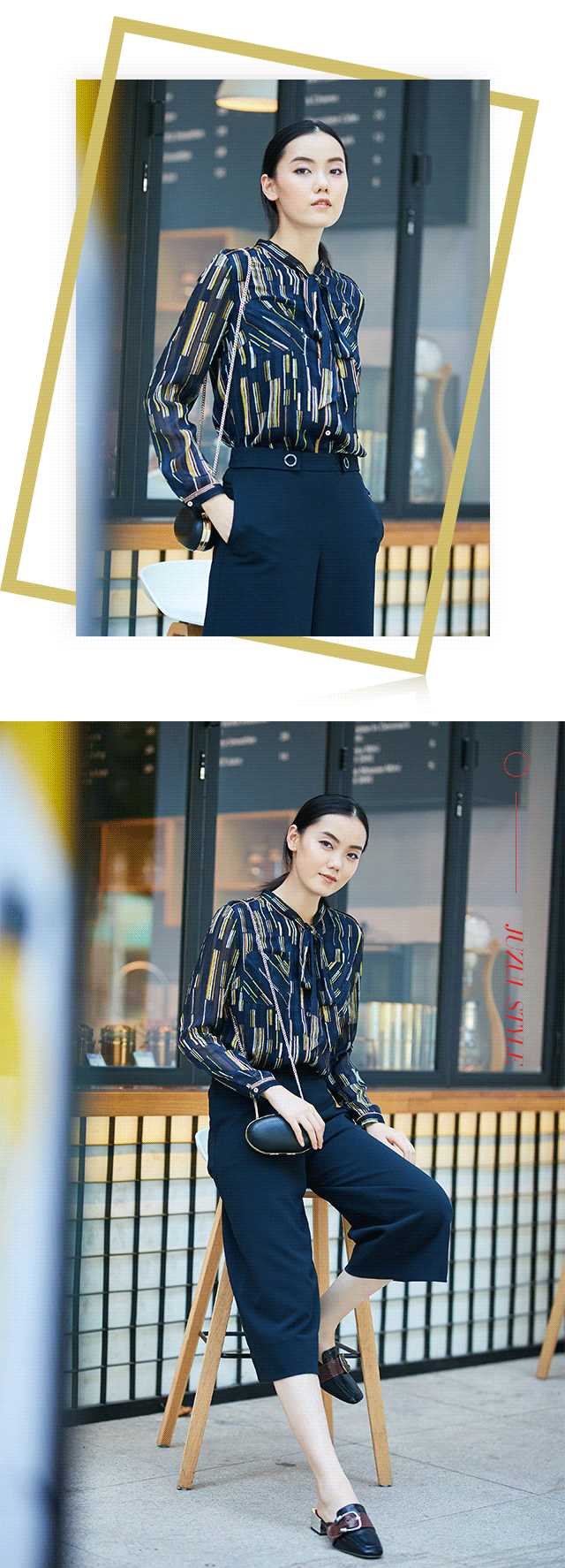 而完全颠覆经典竖条纹的,还属JZ玖姿最新花型——霓虹彩条。繁华都市彻夜如昼,七彩霓虹忽明忽暗,闪烁、跳跃,幻化成视觉里的明媚亮纹,排列得错落有致。本款长袖衬衫采用特殊的玻璃纱面料,令花型若隐若现,如同暗夜里灵动的精灵;系上飘带,复古又精神。