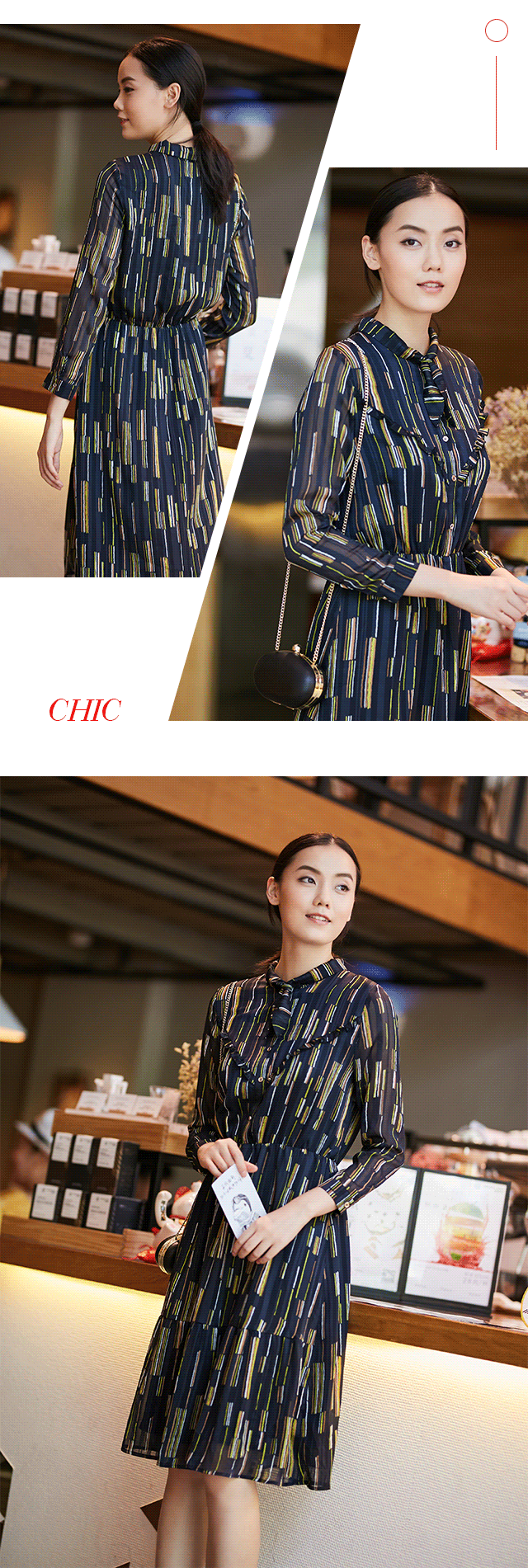 同样花型的中长款连衣裙,领结式飘带,简约精巧,提升气质,显得更为优雅;松紧腰头设计,包容身形,穿衣有范儿。