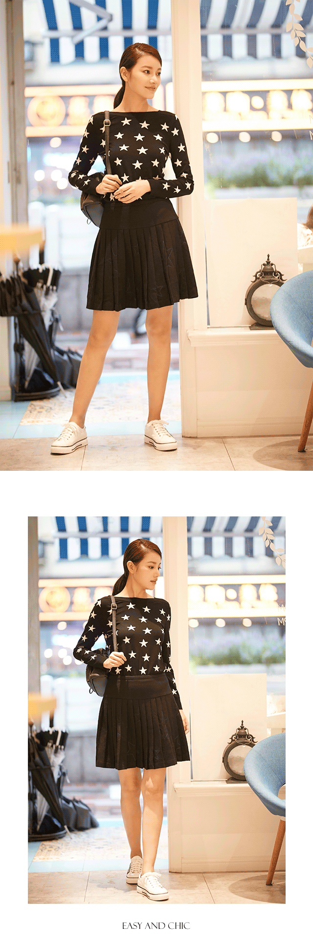 不同材质,焕发不同生命。纤细柔软的美丽诺羊毛,手感细腻穿着舒适,是本款百褶半裙的亮点之一,高腰设计,表现婀娜身姿,将女性柔美展露无疑,搭配一字领毛衫,透露些许性感。漫天繁星缀于其上,古老又神秘,彰显摩登气质。