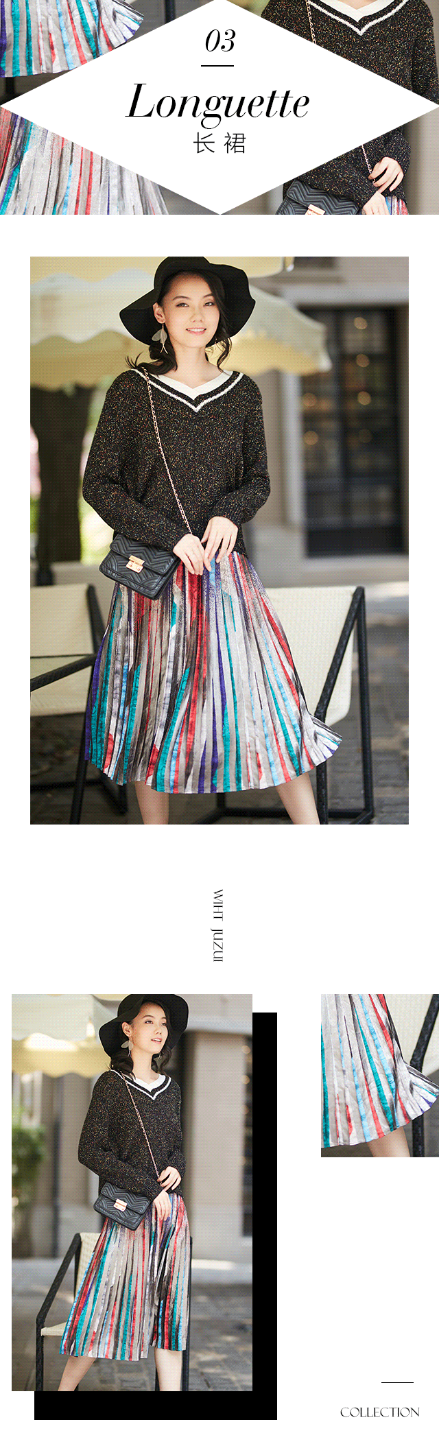 黑白相间的V领毛衫,展现优美锁骨,简约却富有韵味,五彩斑斓的绣线星星点点地散落着,犹如秋日斑驳阳光,暖意由心而生。搭配渐变百褶,银色涂层,前卫时尚。