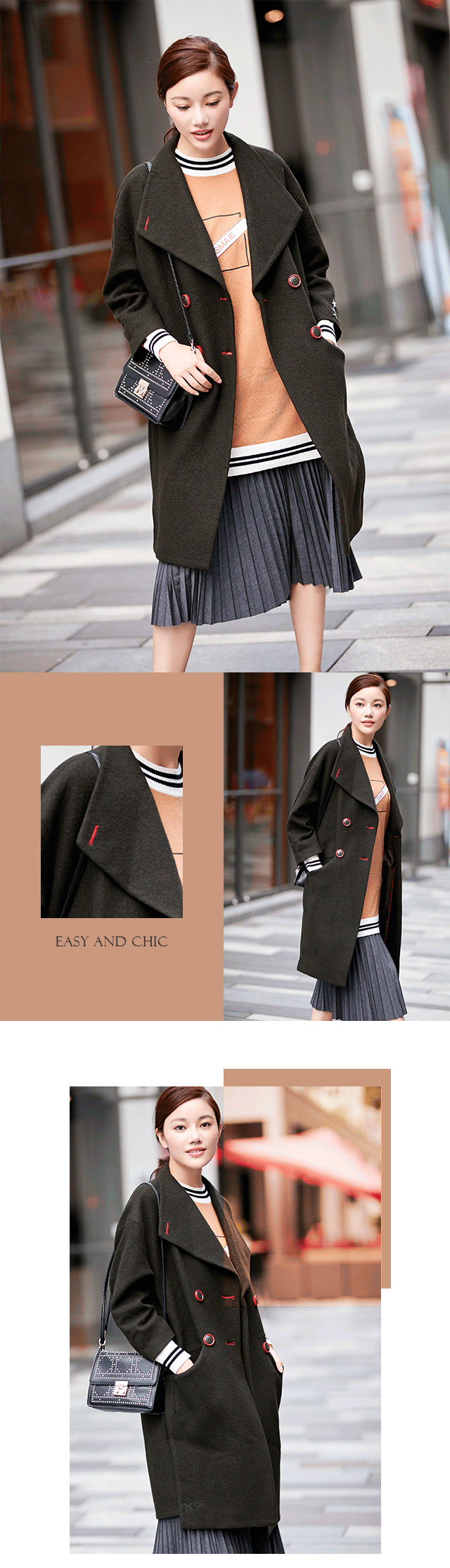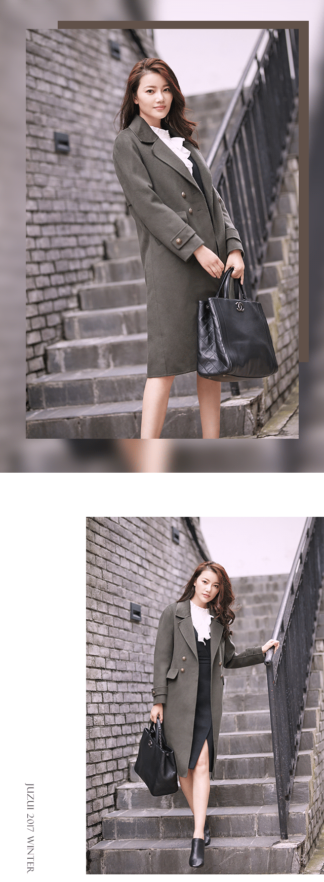 军绿亦是近两年备受时尚圈宠爱的颜色。JZ玖姿本款翻领大衣,风衣款型气场全开,精致铜扣点缀,诠释英伦复古风情,内搭是宫廷小衫与开衩连衣裙的组合,令整体造型,增添了一份知性之感。