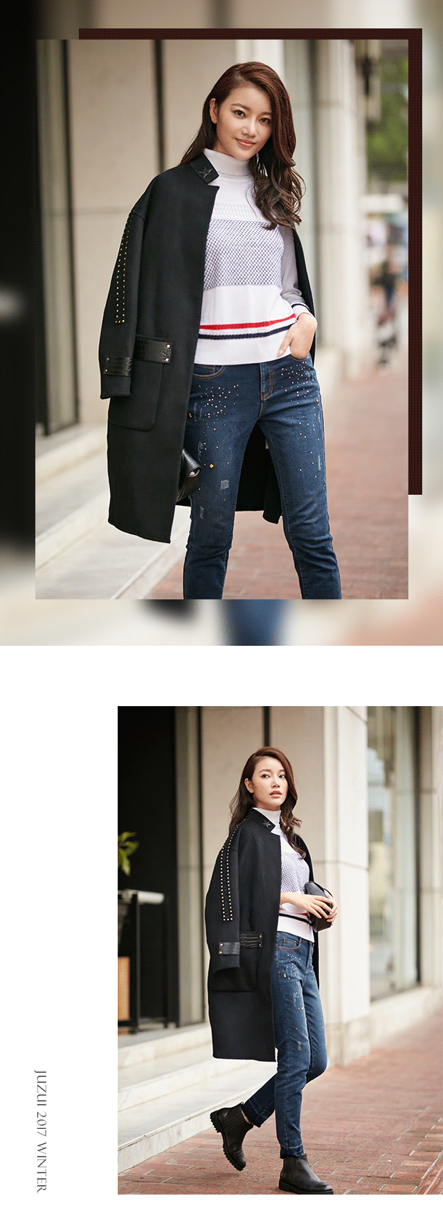 神秘的黑色当然也是风象星座的代表。JZ玖姿本款夜空黑大衣,皮料拼接,为时髦加分,铆钉及星标元素的运用,在经典之中注入潮流趋势,令时装焕发别样新意。轻巧高领小衫搭配毛边牛仔裤及短靴,高挑显英气。