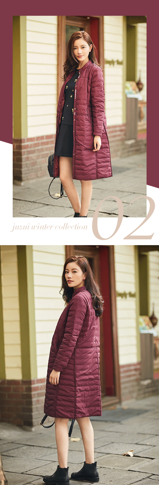 除了黑白,亮色亦是羽绒服的潮流所趋,绛红表层,一眼望去,好像过于鲜艳,实则,其衬托肤色之效极为明显;O字版型与及膝长度,既包容身形又防风御寒,无论到哪儿,都是一道靓丽风景。