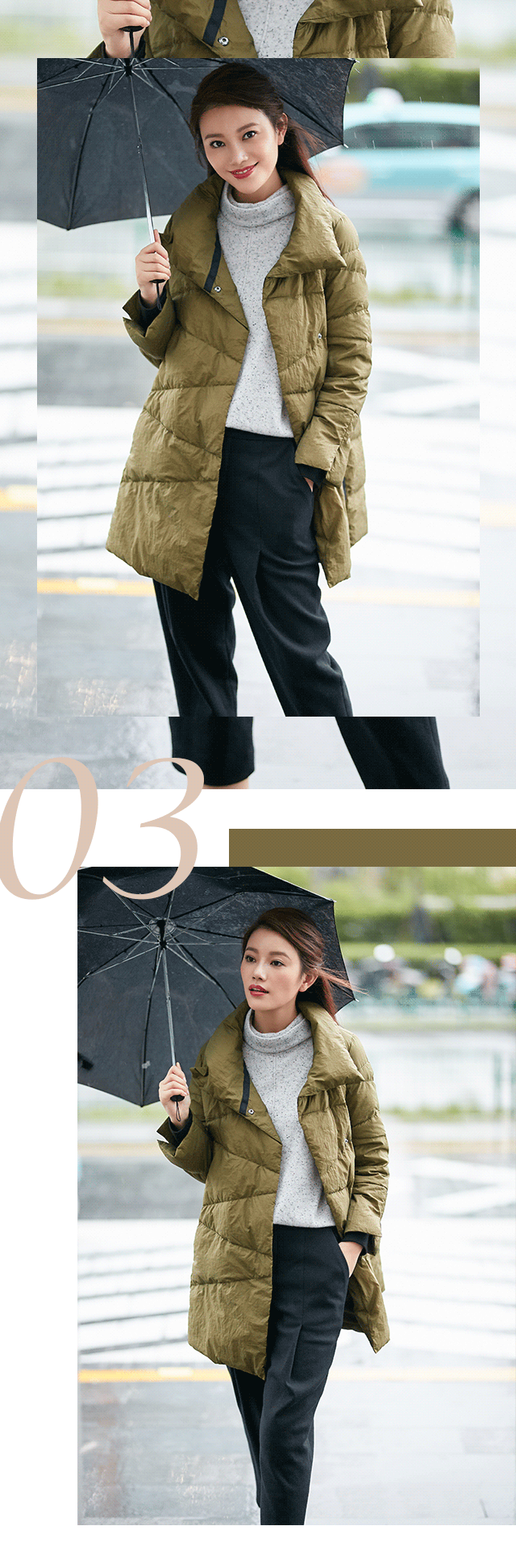 见惯了羽绒的横向纹路,菱形分割是不是令人眼前一亮呢?不规则的走线大大提升了设计感,A字版型又增加了包容性,重点还在于完美围裹颈部的立领,寒风入侵也能温暖如春。