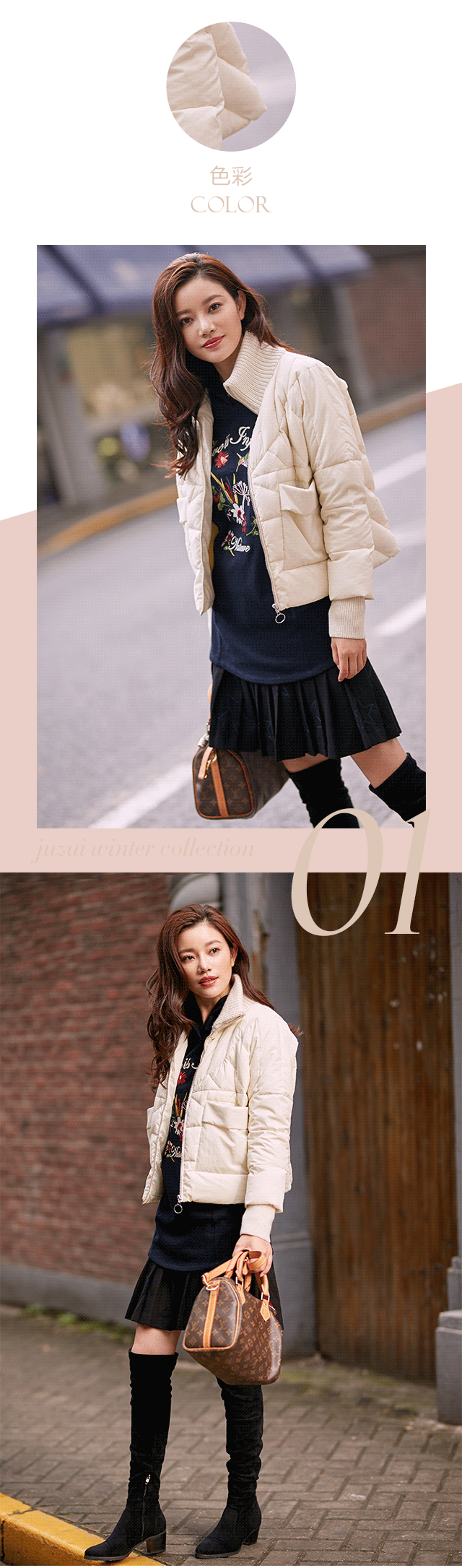 非黑即白,相信是许多人选择冬装的标准,诚然,基础色最不容易出错了。本款纯白羽绒服,在银装素裹的日子里尤为应景;简约廓形与短款款式,更具朝气,内搭卫衣裙,下穿及膝长靴,漫步街头,更显率性。