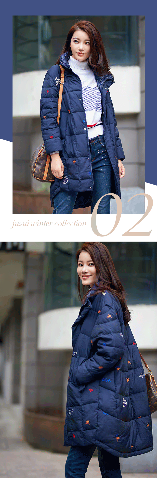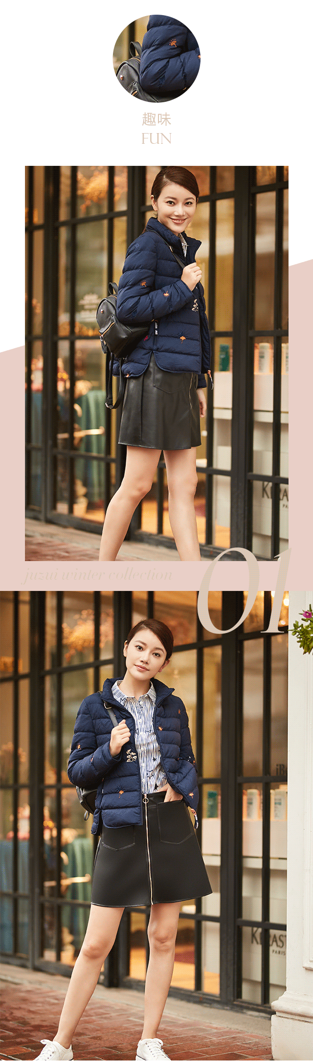 那么不喜亮色的,该如何在萧瑟冬日“突出重围”呢?一抹刺绣就能带来新意。花卉以绽放之姿零星点缀于暮色蓝短款羽绒上,洋溢着些许生机,趣图夹杂其中,又增色不少,背上双肩包,更有青春活力。