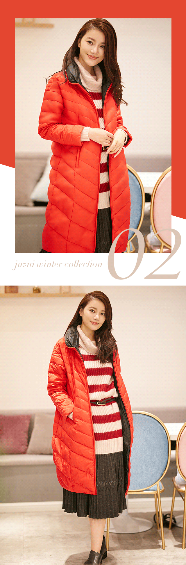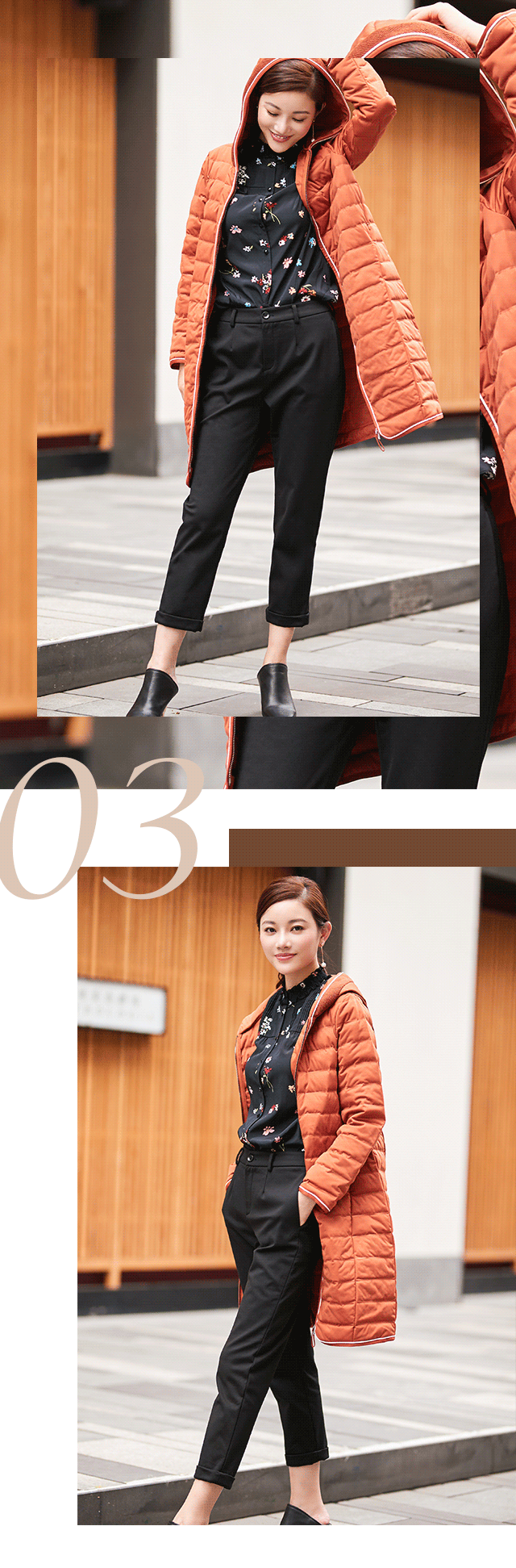 为告别臃肿,本季,JZ玖姿设计师把轻薄作为重点,带来全新的穿着体验。紧密压褶最大程度减少了绒毛的扩展空间,降低厚度的同时,又将温暖牢牢地锁在其中;门襟处的字母织带装饰,正贴合最近盛行的标语时髦,成为造型的点睛之笔。