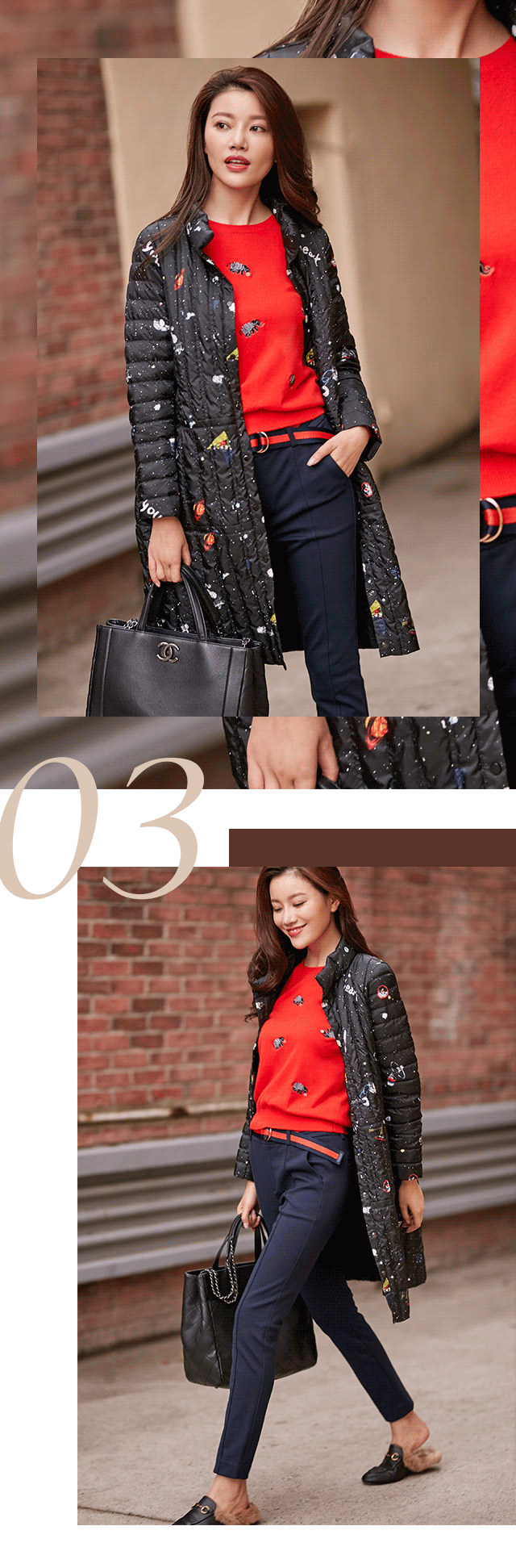 长款羽绒服最毫不费力的内搭当属连衣裙,柔与柔的邂逅,更能体现优雅女人味儿。同为暗色调的苋红与深黑,渲染了这个季节的厚重之感,而裙身的烫金刺绣则提升了整体造型的亮眼度,搭一双长靴,展示腿部曲线,散发迷人魅力。