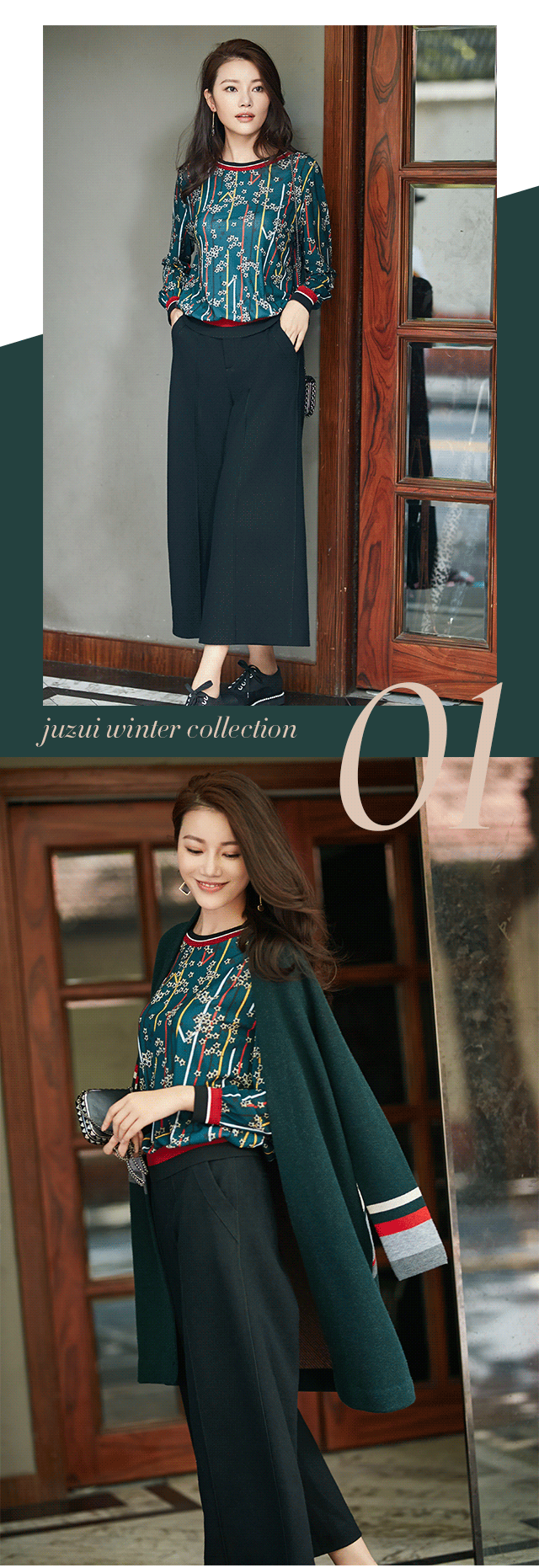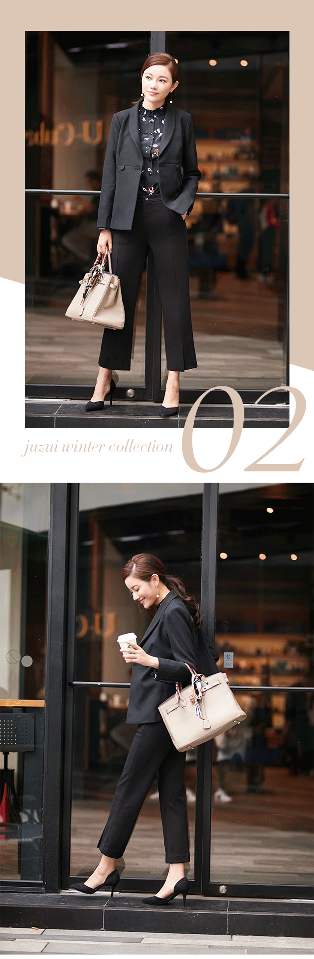 较为正式的场合里,成套穿着的确是不二之选,可为了避免太过呆板,就得在西装裤的选择上下些功夫了。譬如本款,裤脚前部开衩的小细节,提升造型时髦度;再以花色小衫点缀,演绎温柔而大气的职场穿搭。