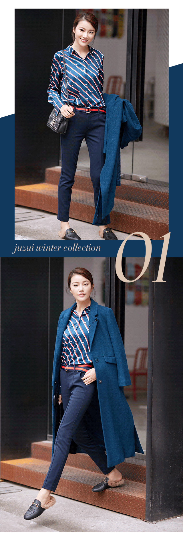 而当本款西装裤搭配丈青双面呢大衣时,却是利落又温婉的,顺色搭配下,服装的高级感不言而喻,撞色腰带装饰,突出腰线,避免五五身材的尴尬。