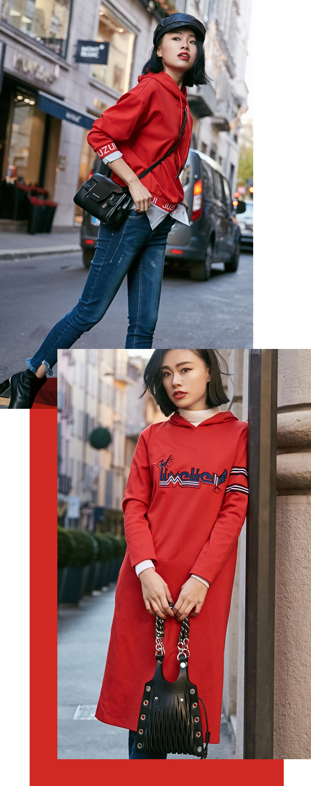 漫步街头,苍翠的圣诞树和闪烁的霓虹灯随处可见,才发现节日的氛围已经十分浓厚,红色卫衣与蓝色牛仔的组合竟格外应景,一顶鸭舌帽,打造个性时尚。