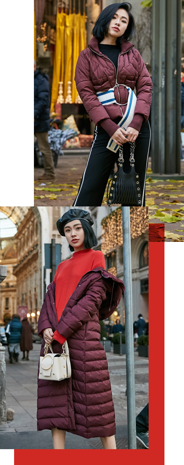 而时尚就是要特立独行。暗红色系的羽绒服即使轻如鸿毛也总会以人沉闷之感,该发挥想象力和创造力的时候到了,Niki仅用一条蓝白腰封,就把曲线绑了出来,时髦翻倍。