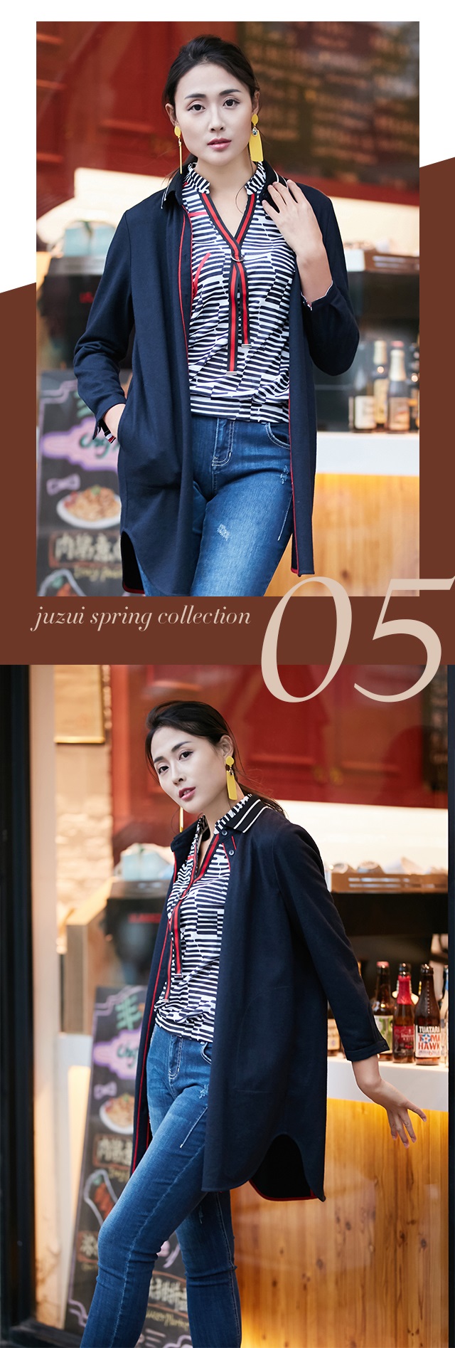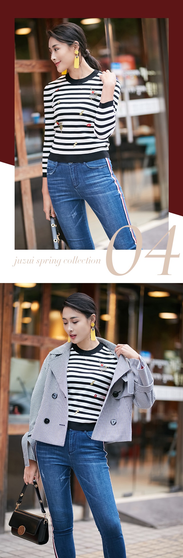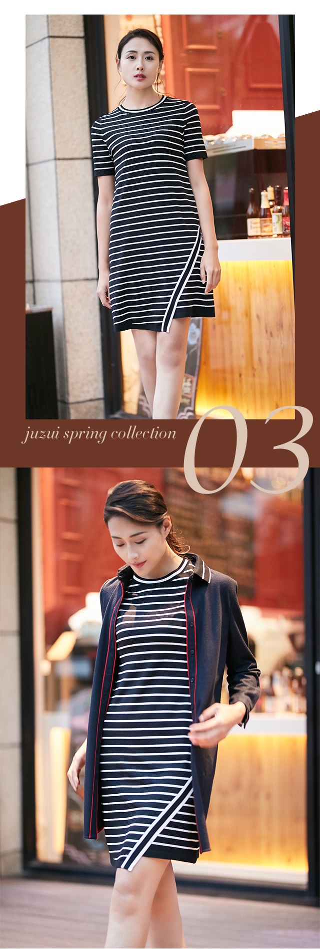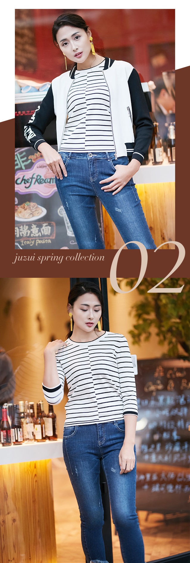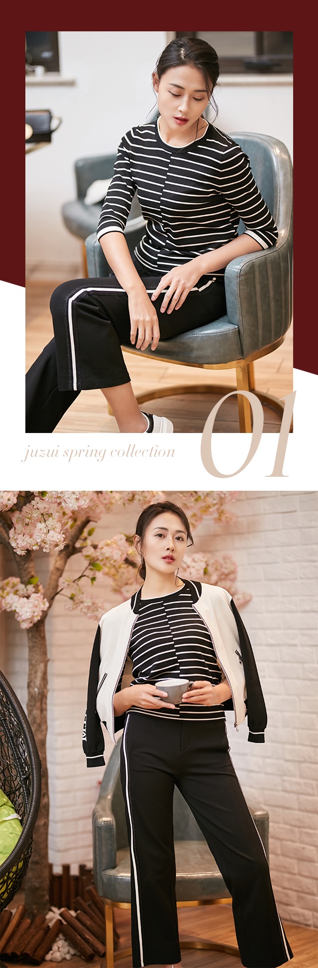 本季,JZ玖姿以经典的黑白配色为基调,运用错落条纹元素,打造简洁大方的条纹look。针织面料舒适透气,具有良好的亲肤性。黑底白条纹衫稳重素雅,白底黑条纹衫则更加清爽,秋冬时节可外搭棒球衫,过渡季节也可选择单穿,搭配牛仔裤或运动裤,洋溢着青春不散场的活力气息。