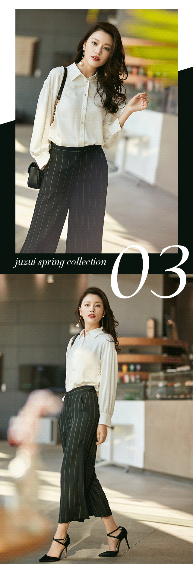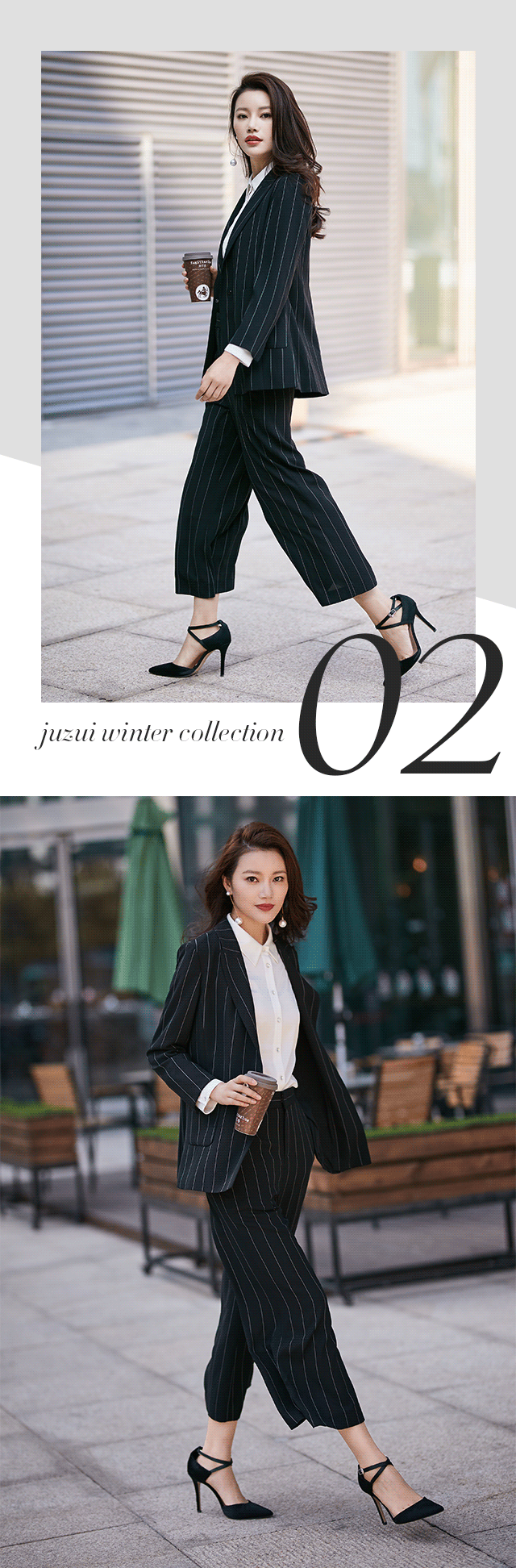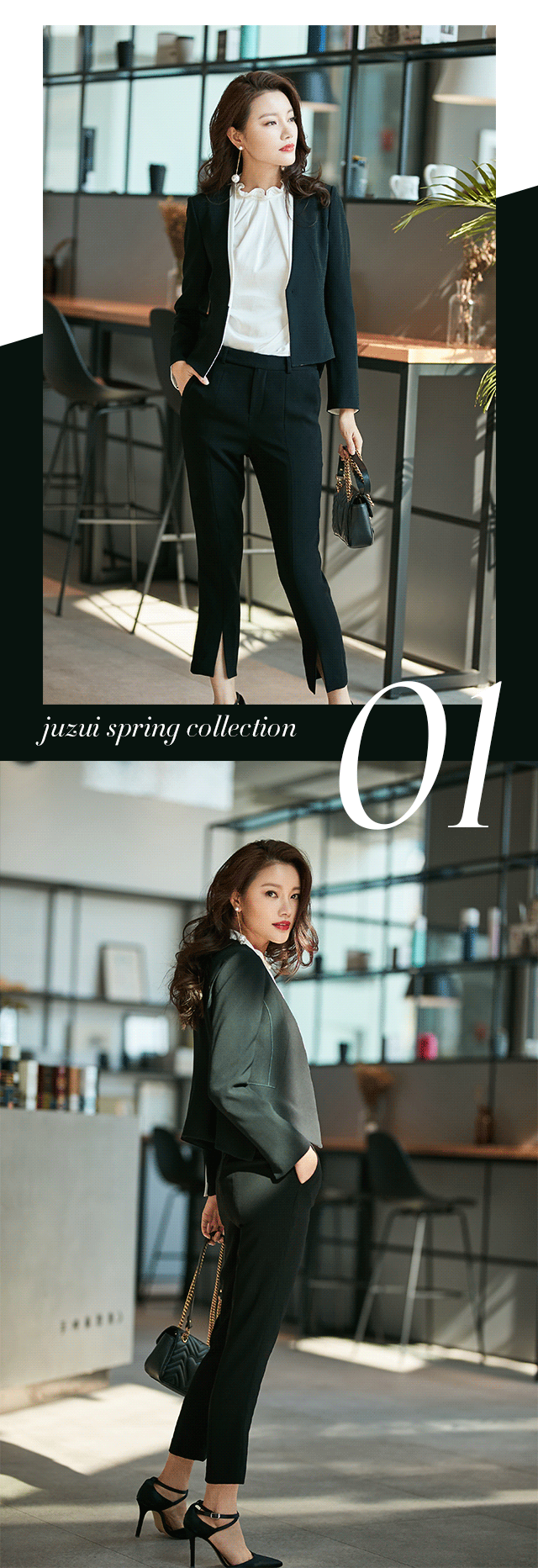 剧中,作为房产经纪的陈善美始终以黑白造型亮相,予人强烈的职业感,无形中提高了可信任度。而本季,JZ玖姿也秉承非黑即白的时尚态度,推出职场高级系列。三醋酸材质短款西装,立体剪裁,挺括又收身,与九分开衩微喇裤配合,化身时髦女郎。