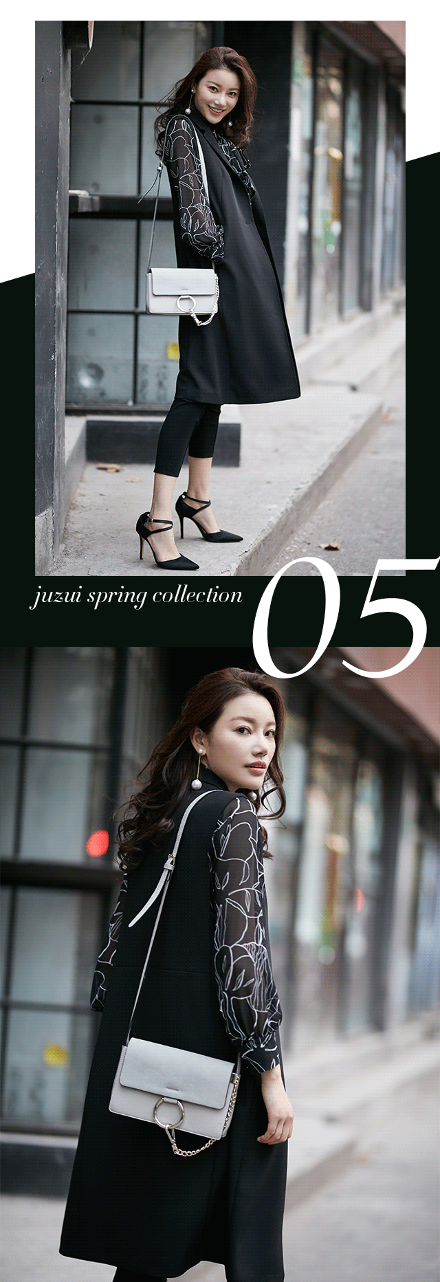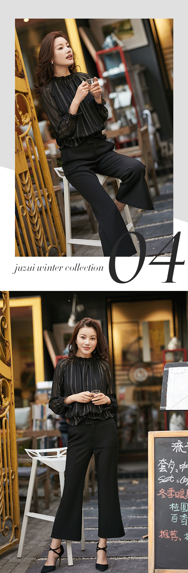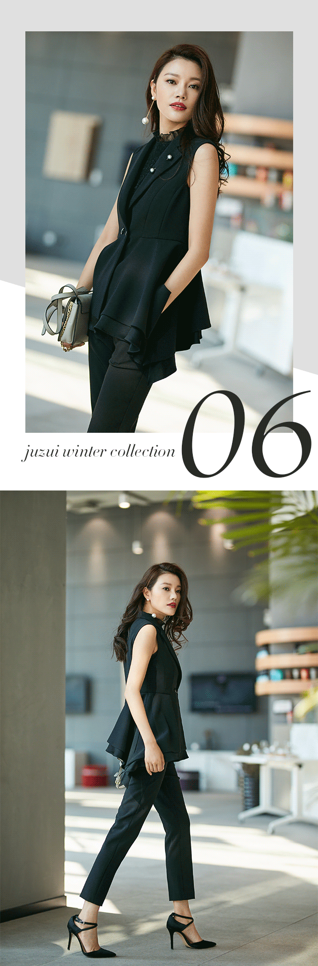 剧中,作为房产经纪的陈善美始终以黑白造型亮相,予人强烈的职业感,无形中提高了可信任度。而本季,JZ玖姿也秉承非黑即白的时尚态度,推出职场高级系列。三醋酸材质短款西装,立体剪裁,挺括又收身,与九分开衩微喇裤配合,化身时髦女郎。