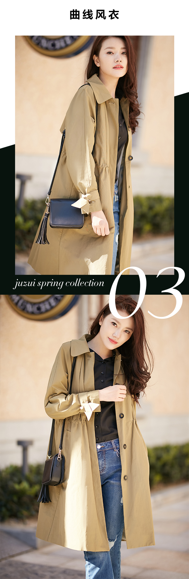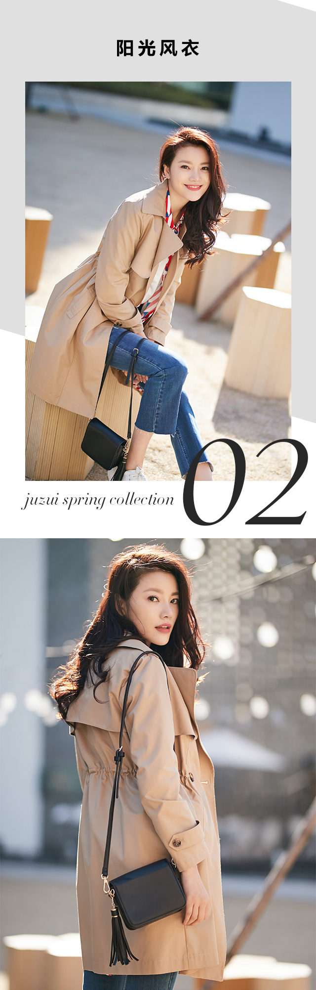肩窄的姑娘可以选择带有肩章的款式,肩宽的姑娘则更适合落肩的oversized款式。JZ玖姿“阳光风衣”选用韩国进口料——棉锦混纺面料,它具有防静电、防辐射等功能,在阳光下更显色,设计上则选用大翻领的领型,凸显大方气质。春季户外踏青,内搭牛仔裤和白衬衣,最是有型。