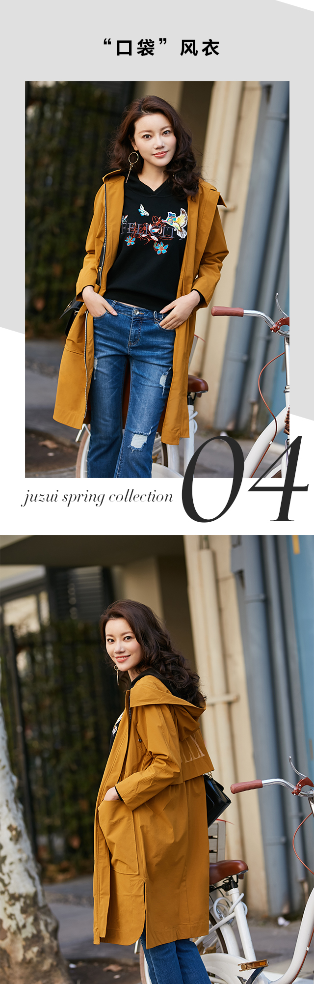 织带、印字元素也是近两年备受时尚圈宠爱的流行元素,JZ玖姿以织带装饰风衣,后背印字元素呈现运动风潮,加上活力十足的兜帽与大口袋设计,减龄效果MAX。