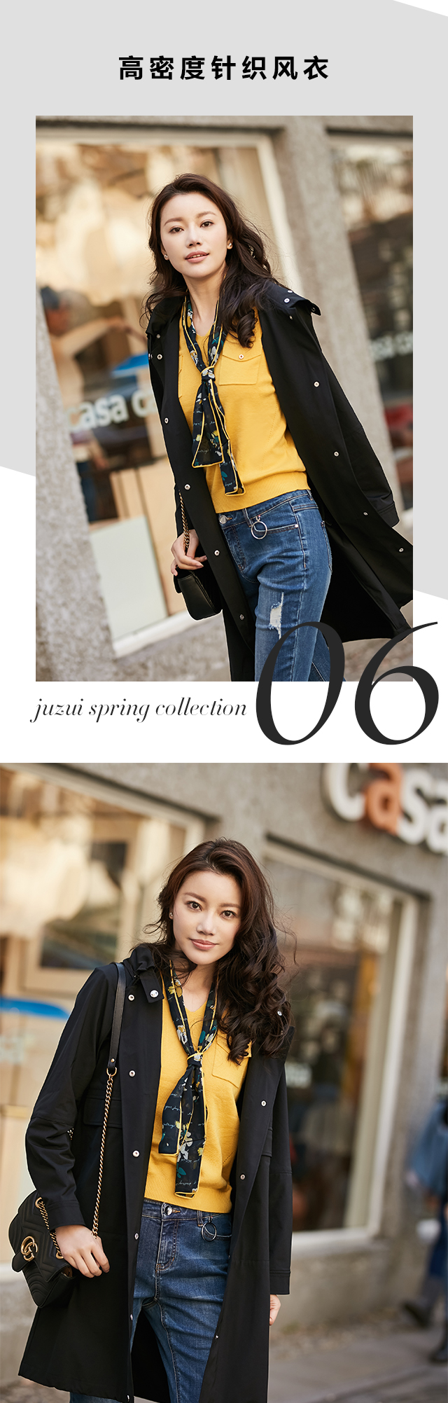 春天,没有比风衣更适合户外的了,走路带风,温暖兼之。因此,很多风衣的设计都会考虑功能性。日本进口的高密度针织风衣料有很强的挺括性和伸缩防水性,穿着防风、舒适,很适合户外穿着。JZ玖姿在此面料基础上,加入了实用的细节——领口的金属四合扣,它可以把帽子圈起来包住,变成立领的款式,穿着者可以根据不同场景调整衣着状态。